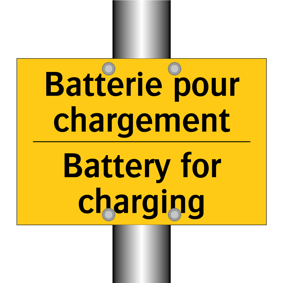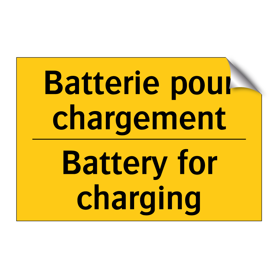 Panneau d'avertissement bilingue avec texte en français : "Batterie pour chargement", et en anglais : "Battery for charging"