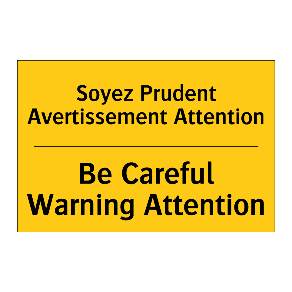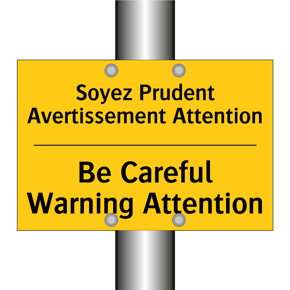 Panneau d'avertissement bilingue avec texte en français : "Soyez Prudent Avertissement Attention", et en anglais : "Be Careful Warning Attention"