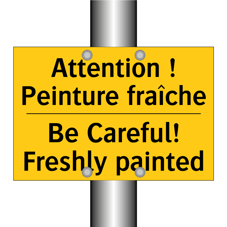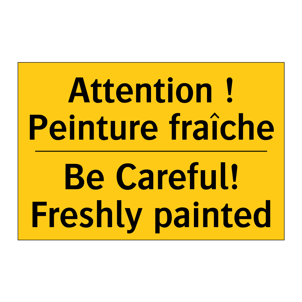 Panneau d'avertissement bilingue avec texte en français : "Attention ! Peinture fraîche", et en anglais : "Be Careful! Freshly painted"