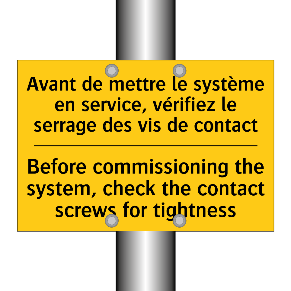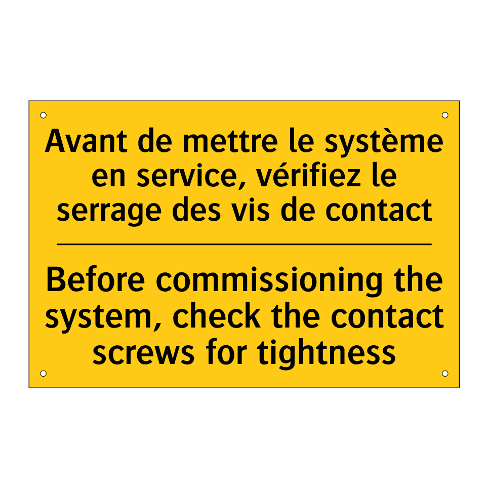 Panneau d'avertissement bilingue avec texte en français : "Avant de mettre le système en service, vérifiez le serrage des vis de contact", et en anglais : "Before commissioning the system, check the contact screws for tightness"
