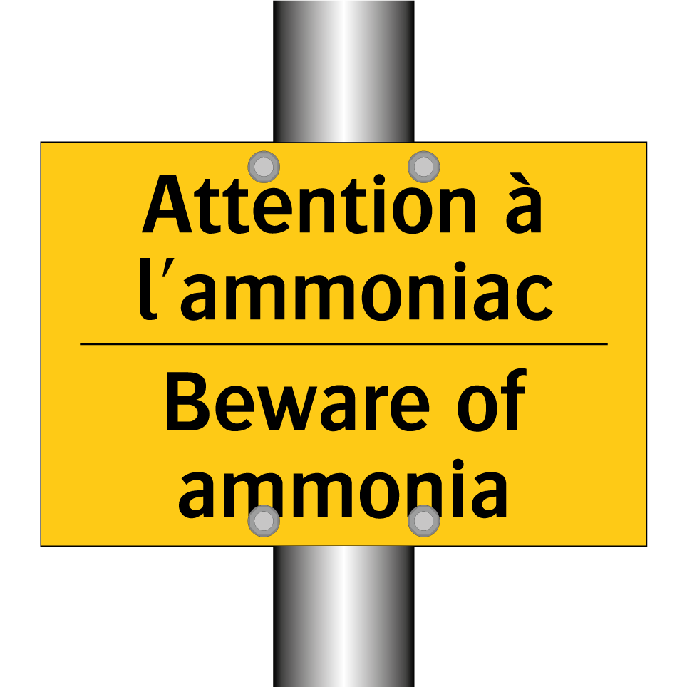 Panneau d'avertissement bilingue avec texte en français : "Attention à l'ammoniac", et en anglais : "Beware of ammonia"