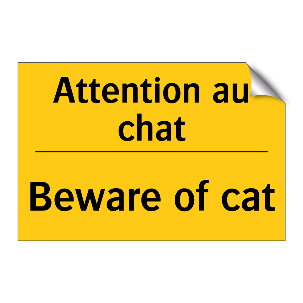 Panneau d'avertissement bilingue avec texte en français : "Attention au chat", et en anglais : "Beware of cat"