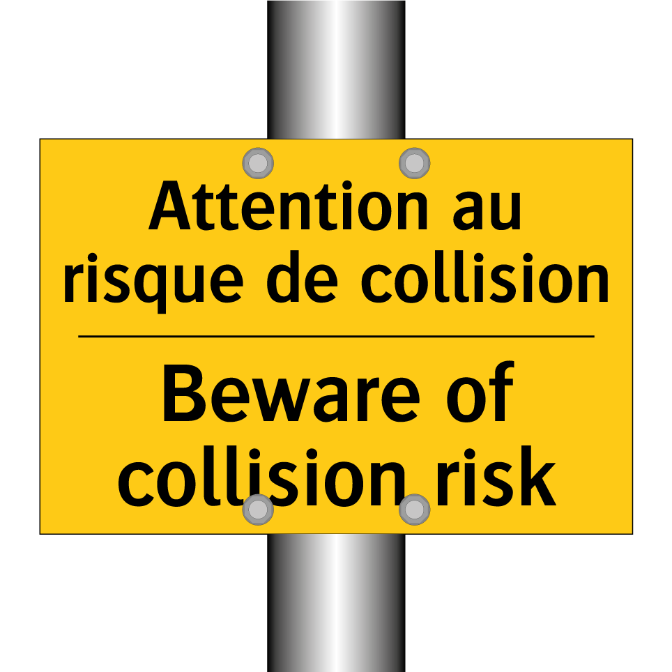 Panneau d'avertissement bilingue avec texte en français : "Attention au risque de collision", et en anglais : "Beware of collision risk"