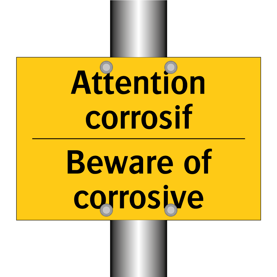 Panneau d'avertissement bilingue avec texte en français : "Attention corrosif", et en anglais : "Beware of corrosive"