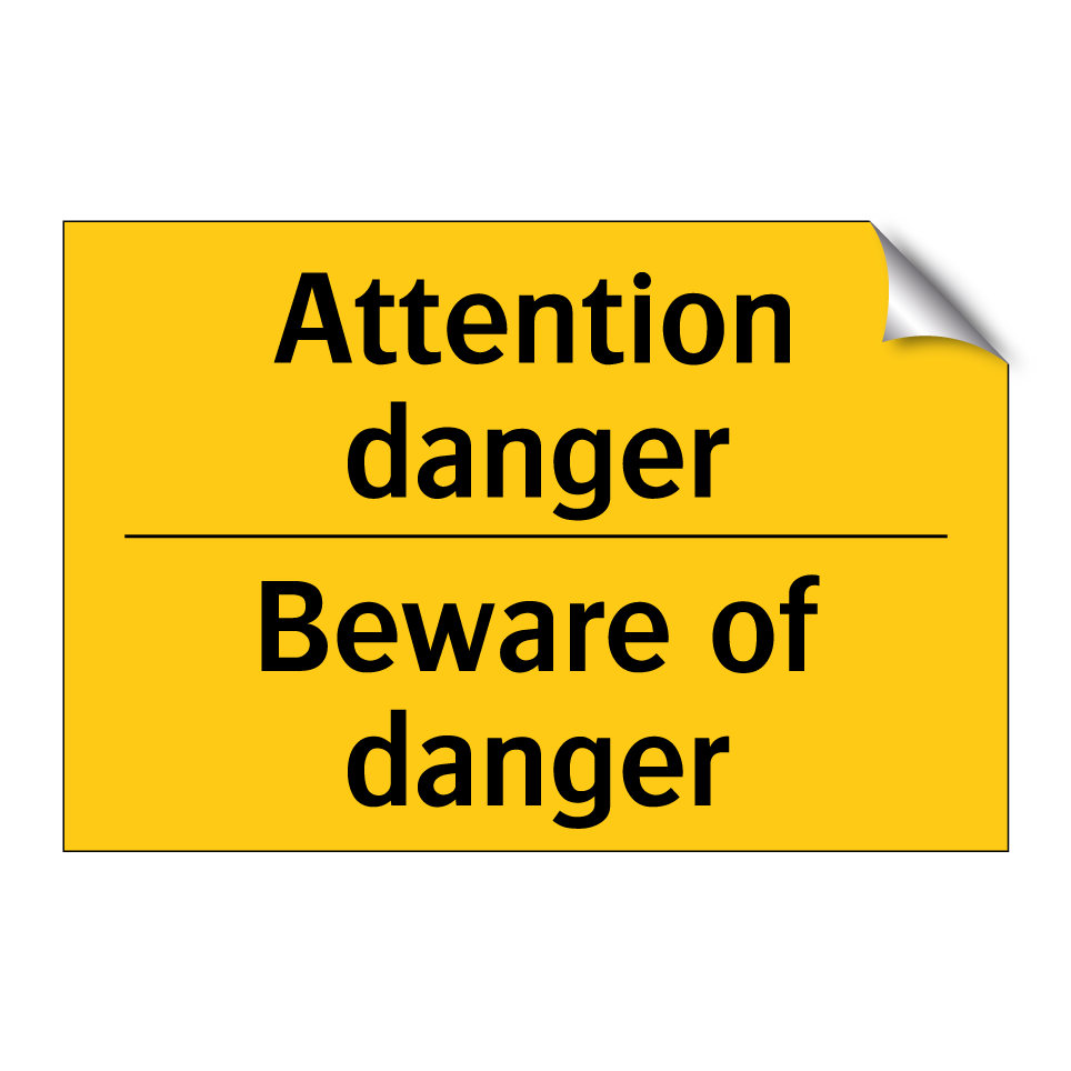 Panneau d'avertissement bilingue avec texte en français : "Attention danger", et en anglais : "Beware of danger"