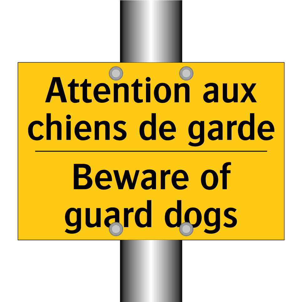 Panneau d'avertissement bilingue avec texte en français : "Attention aux chiens de garde", et en anglais : "Beware of guard dogs"