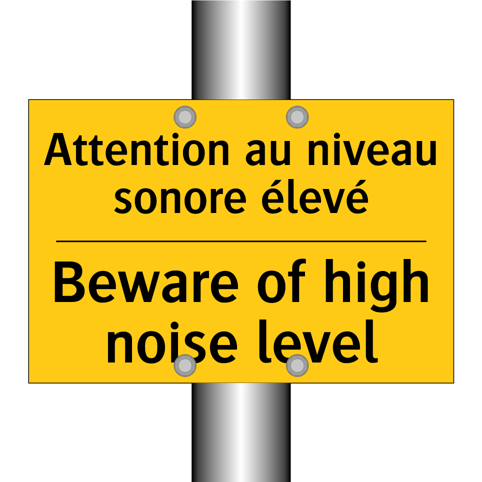 Panneau d'avertissement bilingue avec texte en français : "Attention au niveau sonore élevé", et en anglais : "Beware of high noise level"