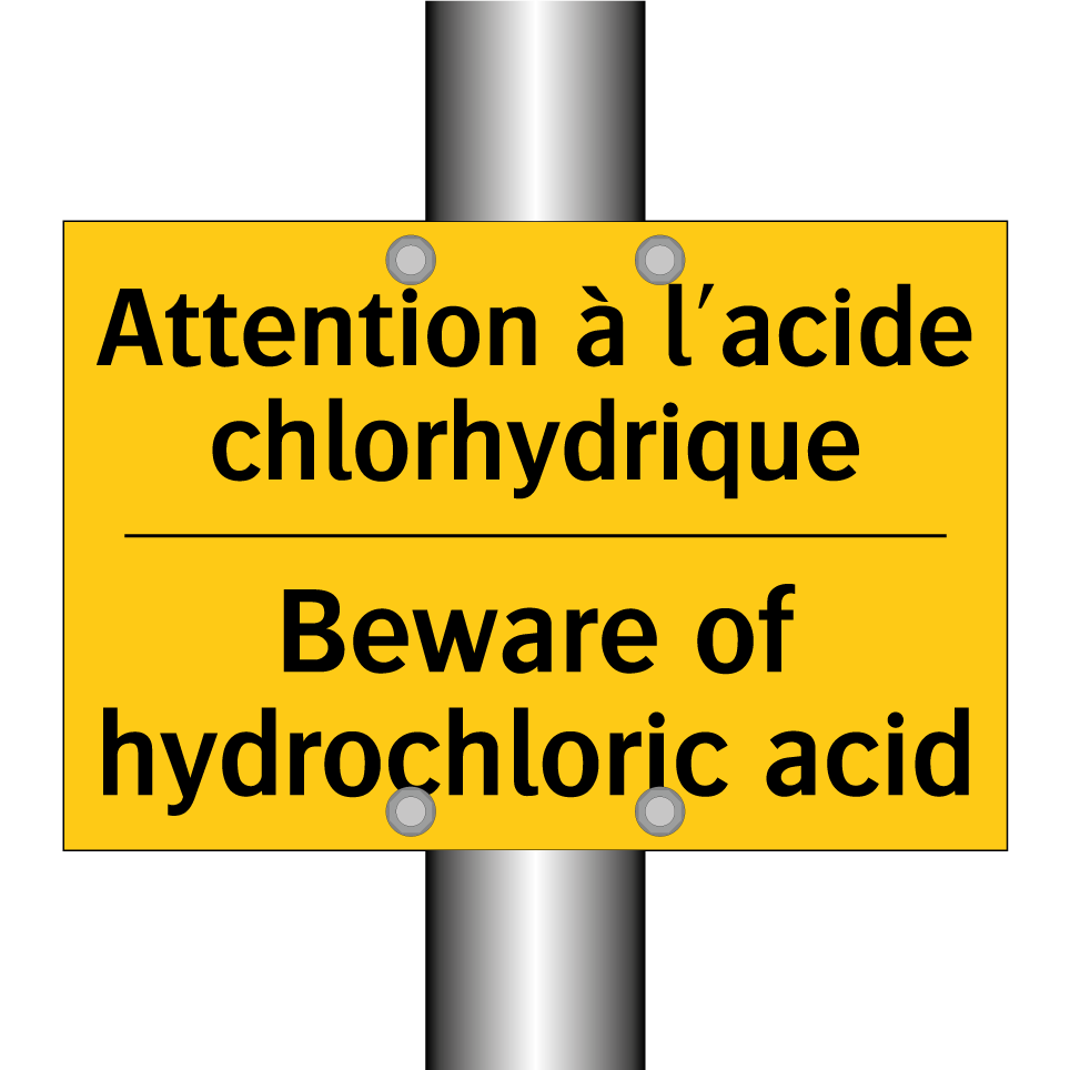 Panneau d'avertissement bilingue avec texte en français : "Attention à l'acide chlorhydrique", et en anglais : "Beware of hydrochloric acid"