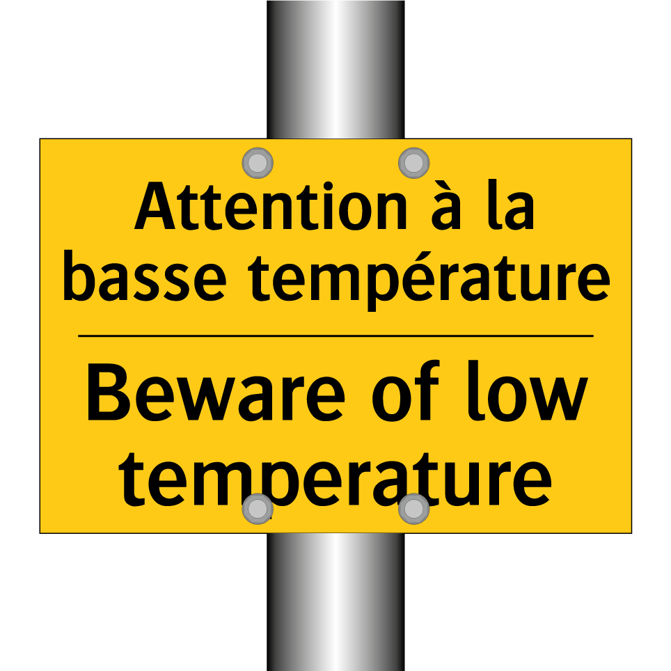 Panneau d'avertissement bilingue avec texte en français : "Attention à la basse température", et en anglais : "Beware of low temperature"