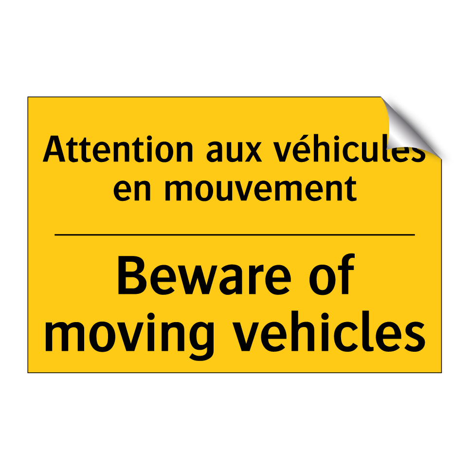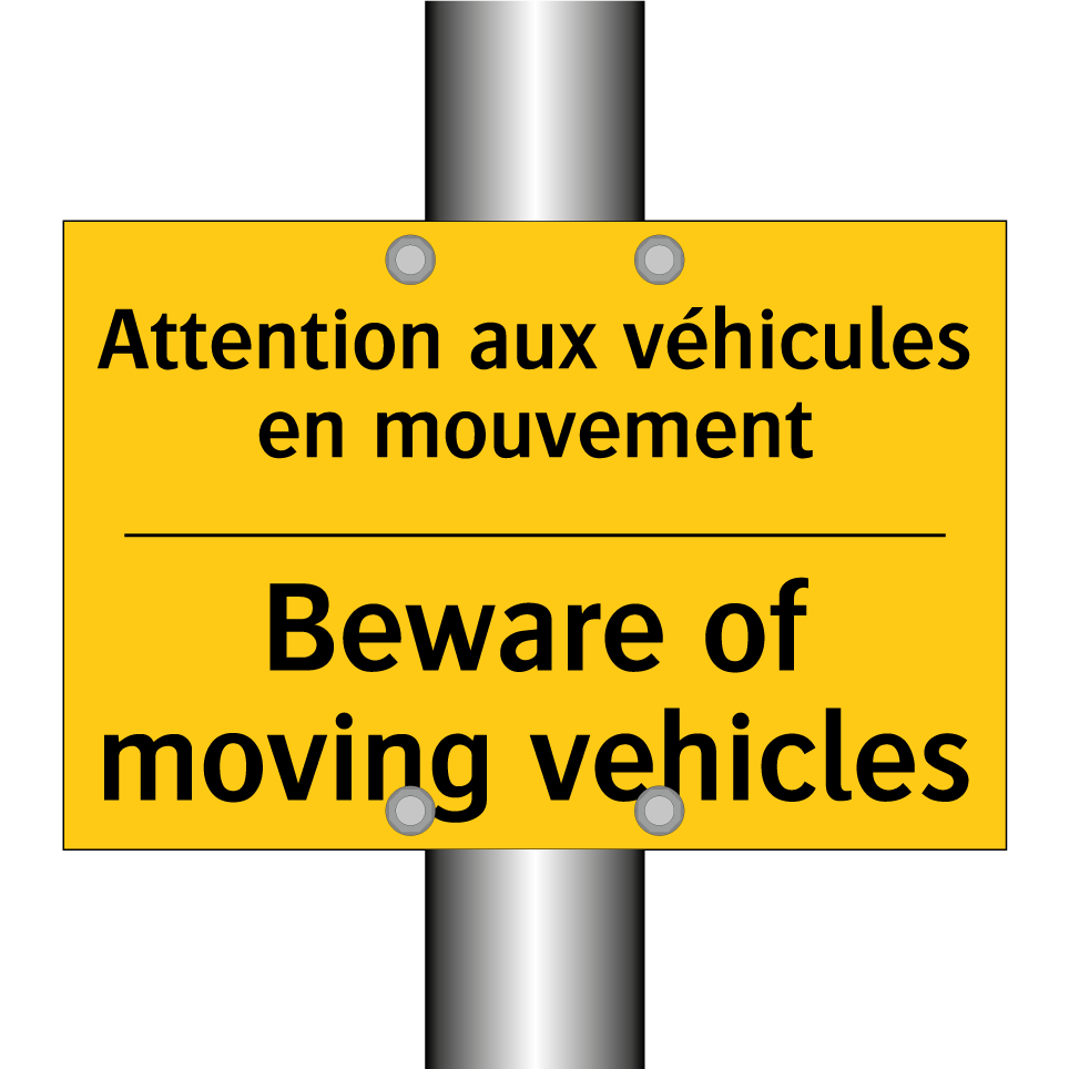 Panneau d'avertissement bilingue avec texte en français : "Attention aux véhicules en mouvement", et en anglais : "Beware of moving vehicles"