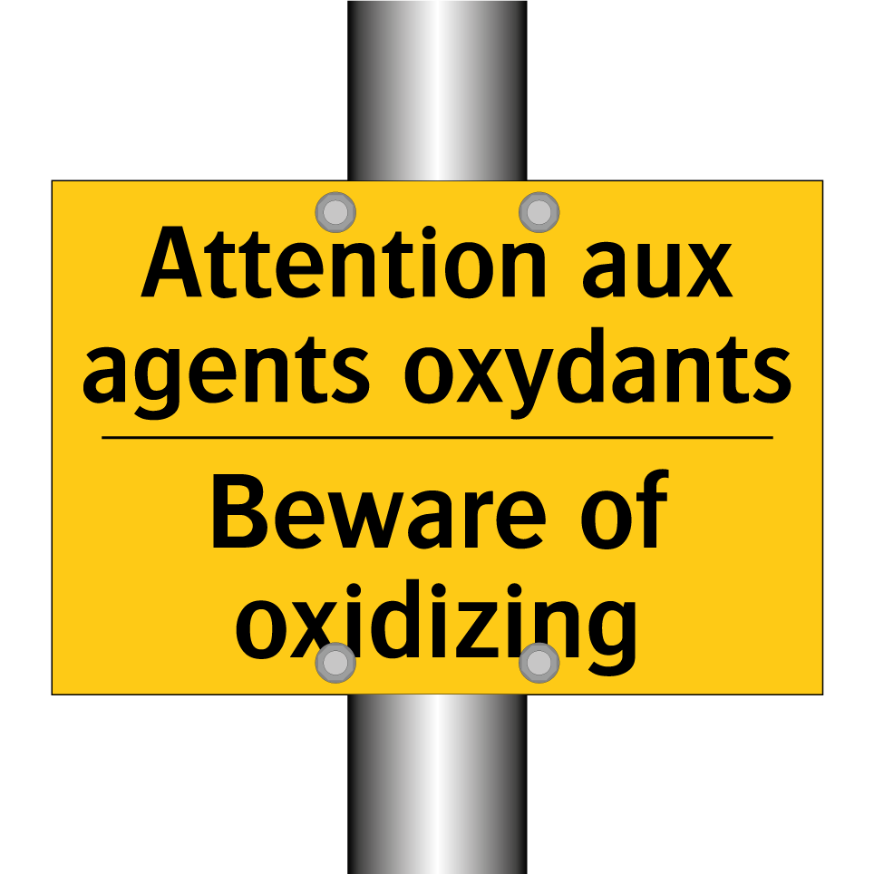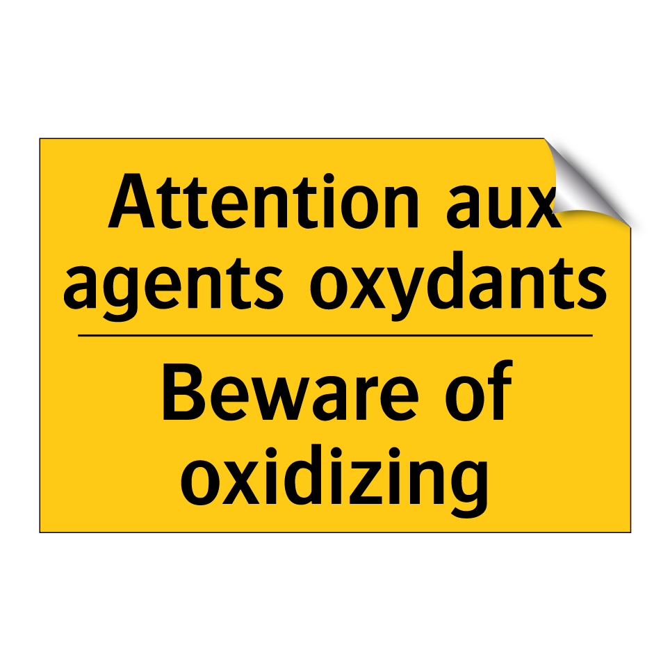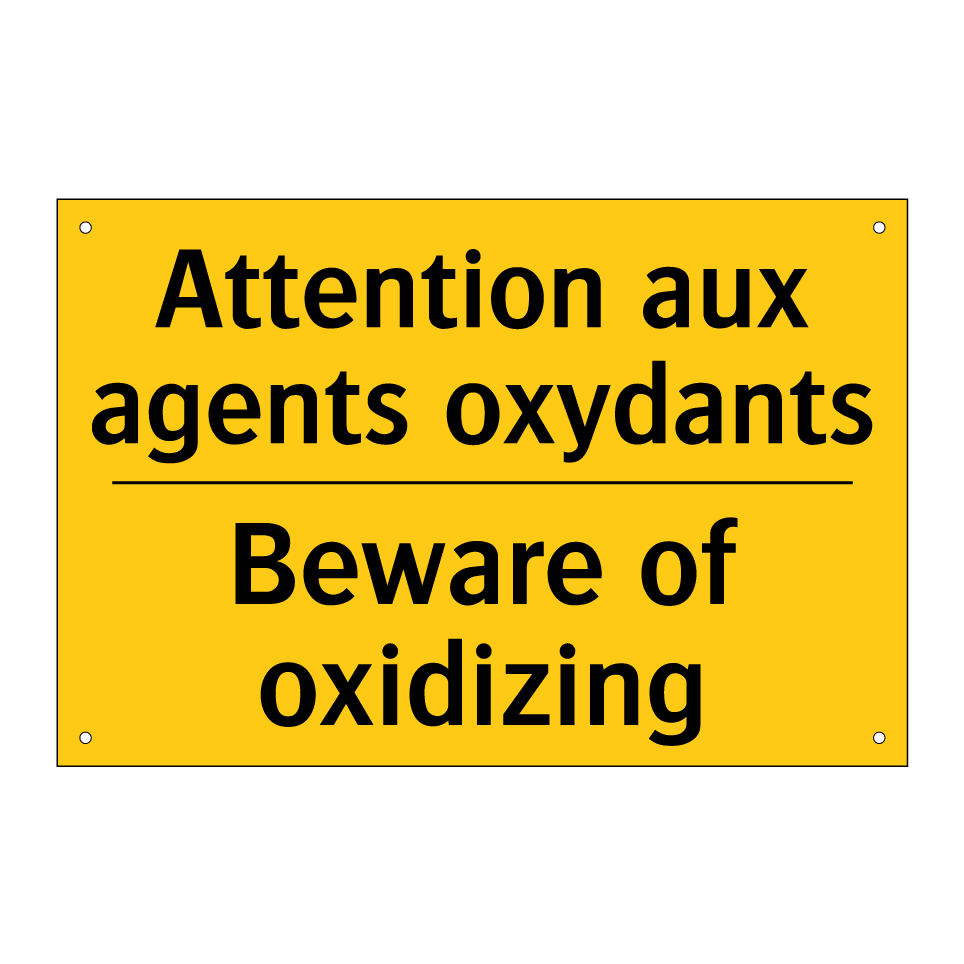 Panneau d'avertissement bilingue avec texte en français : "Attention aux agents oxydants", et en anglais : "Beware of oxidizing"