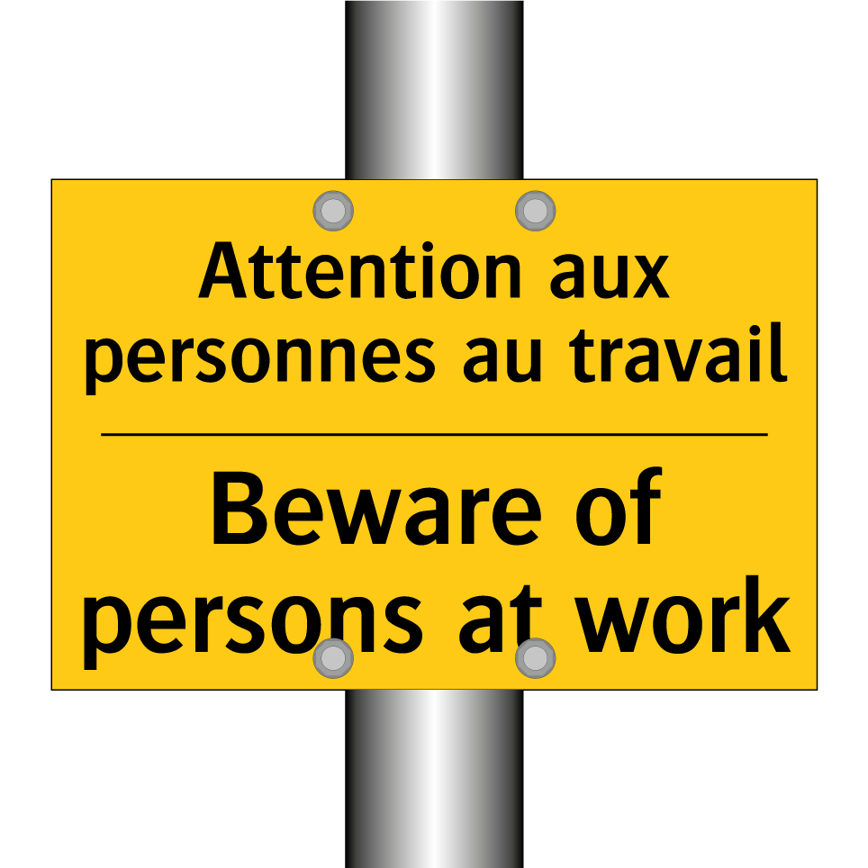 Panneau d'avertissement bilingue avec texte en français : "Attention aux personnes au travail", et en anglais : "Beware of persons at work"