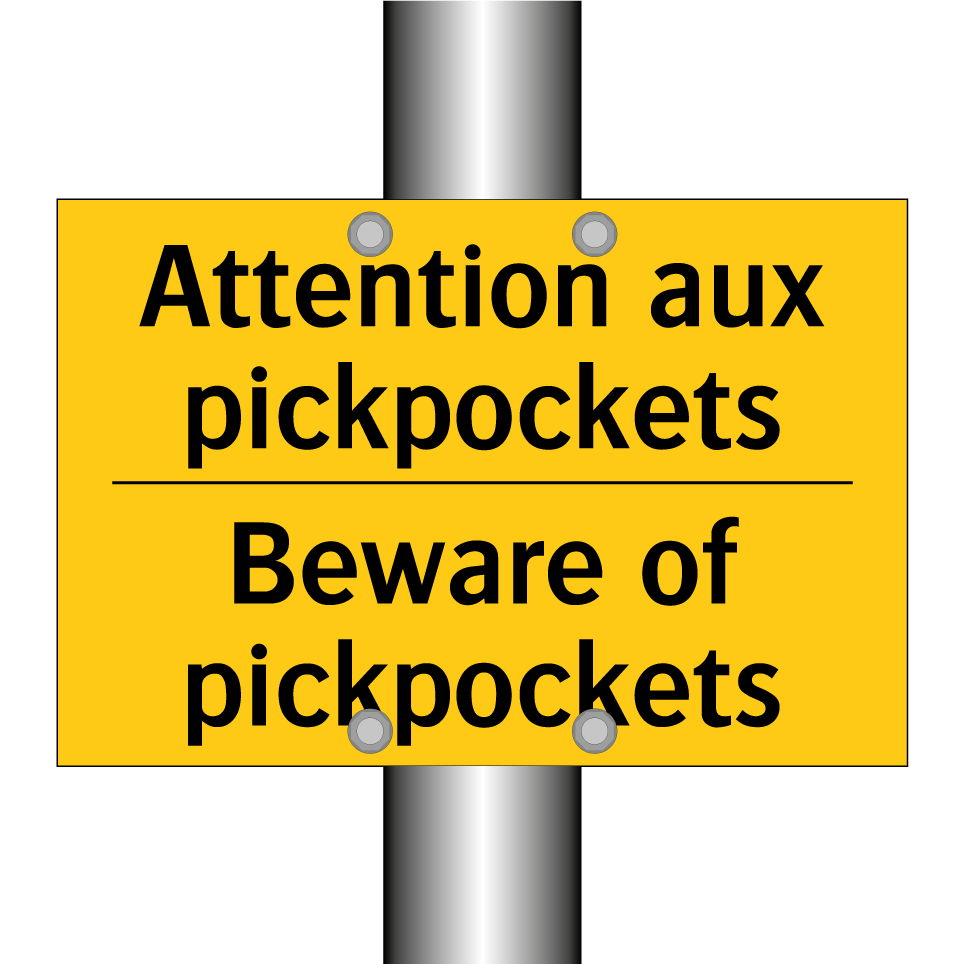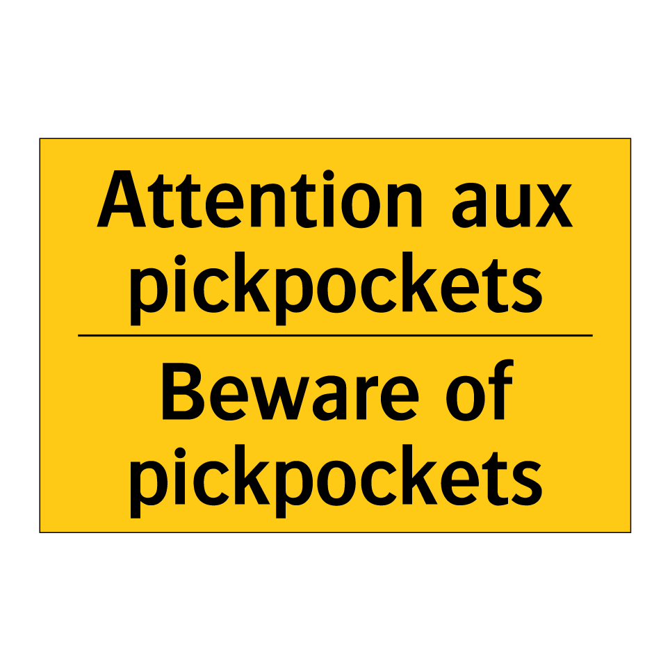 Panneau d'avertissement bilingue avec texte en français : "Attention aux pickpockets", et en anglais : "Beware of pickpockets"