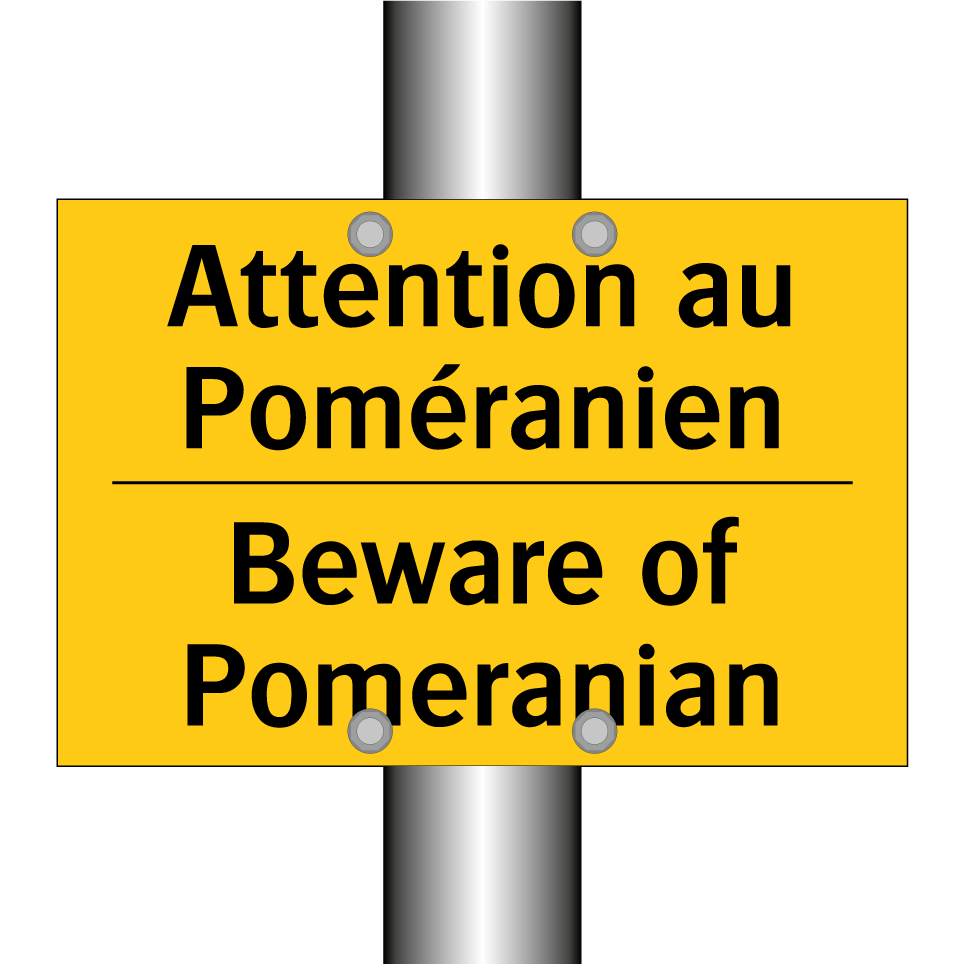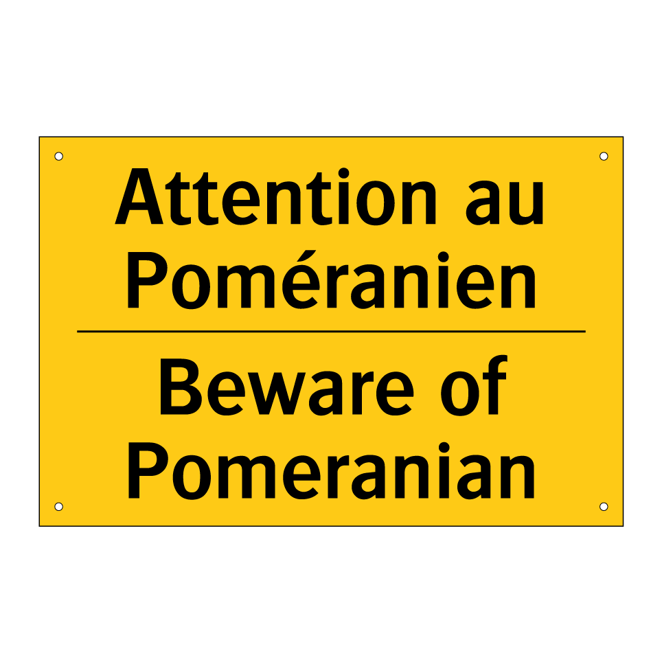 Panneau d'avertissement bilingue avec texte en français : "Attention au Poméranien", et en anglais : "Beware of Pomeranian"