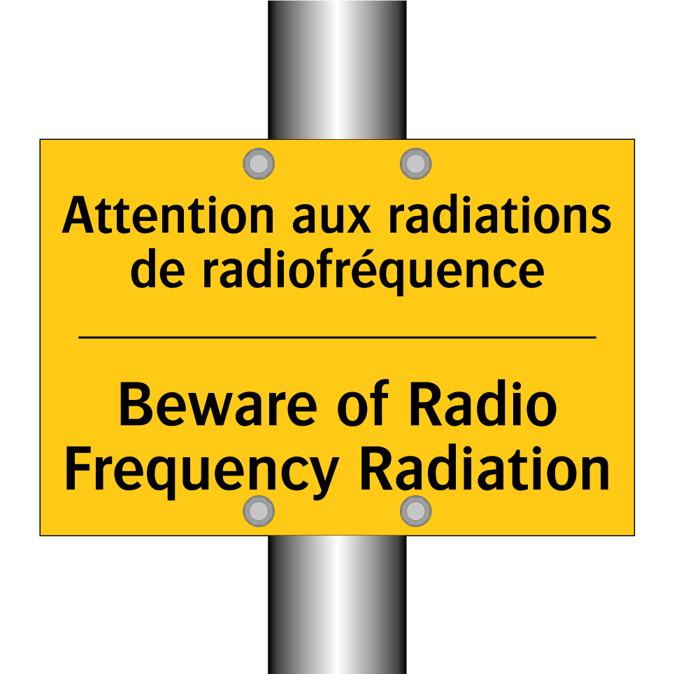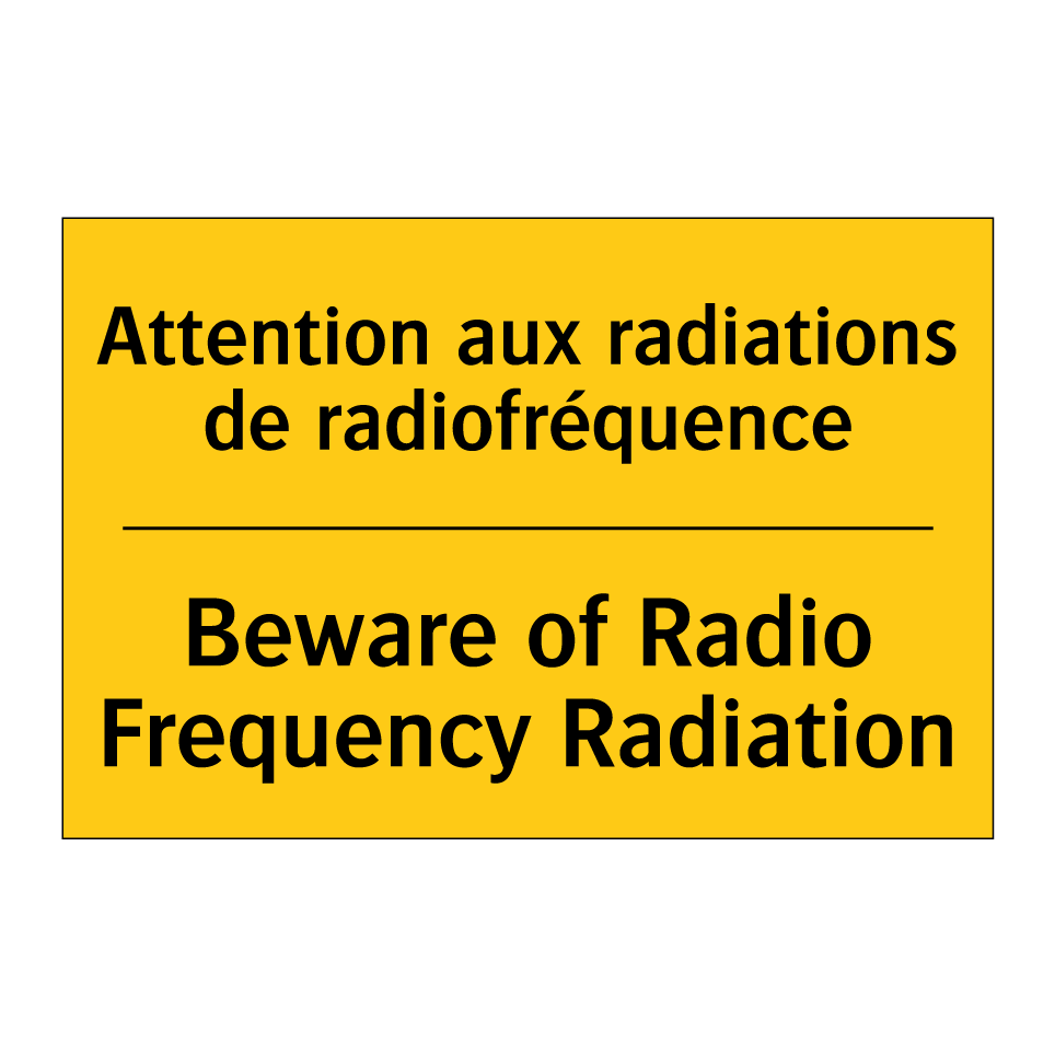 Panneau d'avertissement bilingue avec texte en français : "Attention aux radiations de radiofréquence", et en anglais : "Beware of Radio Frequency Radiation"