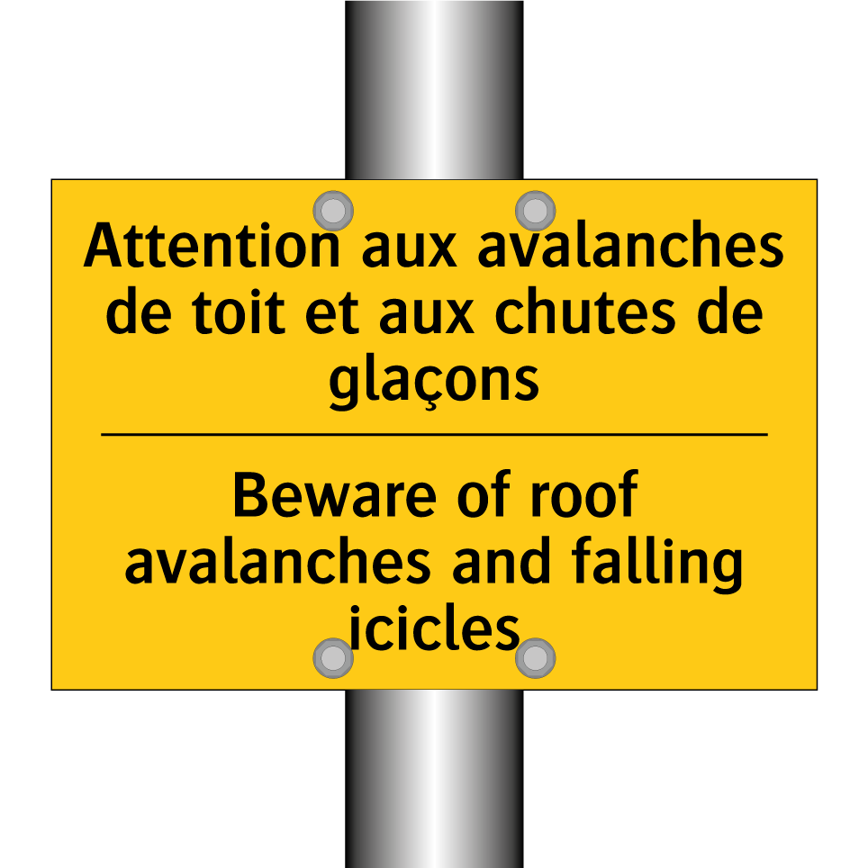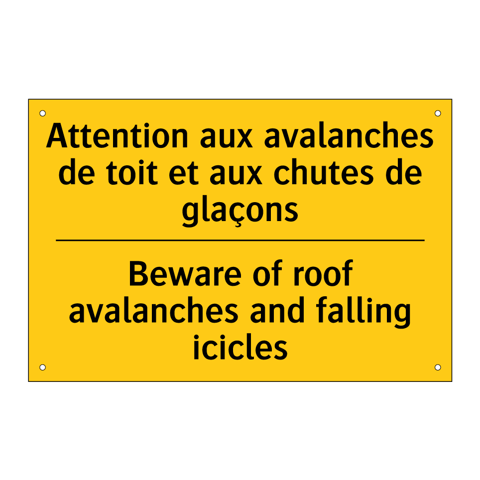 Panneau d'avertissement bilingue avec texte en français : "Attention aux avalanches de toit et aux chutes de glaçons", et en anglais : "Beware of roof avalanches and falling icicles"