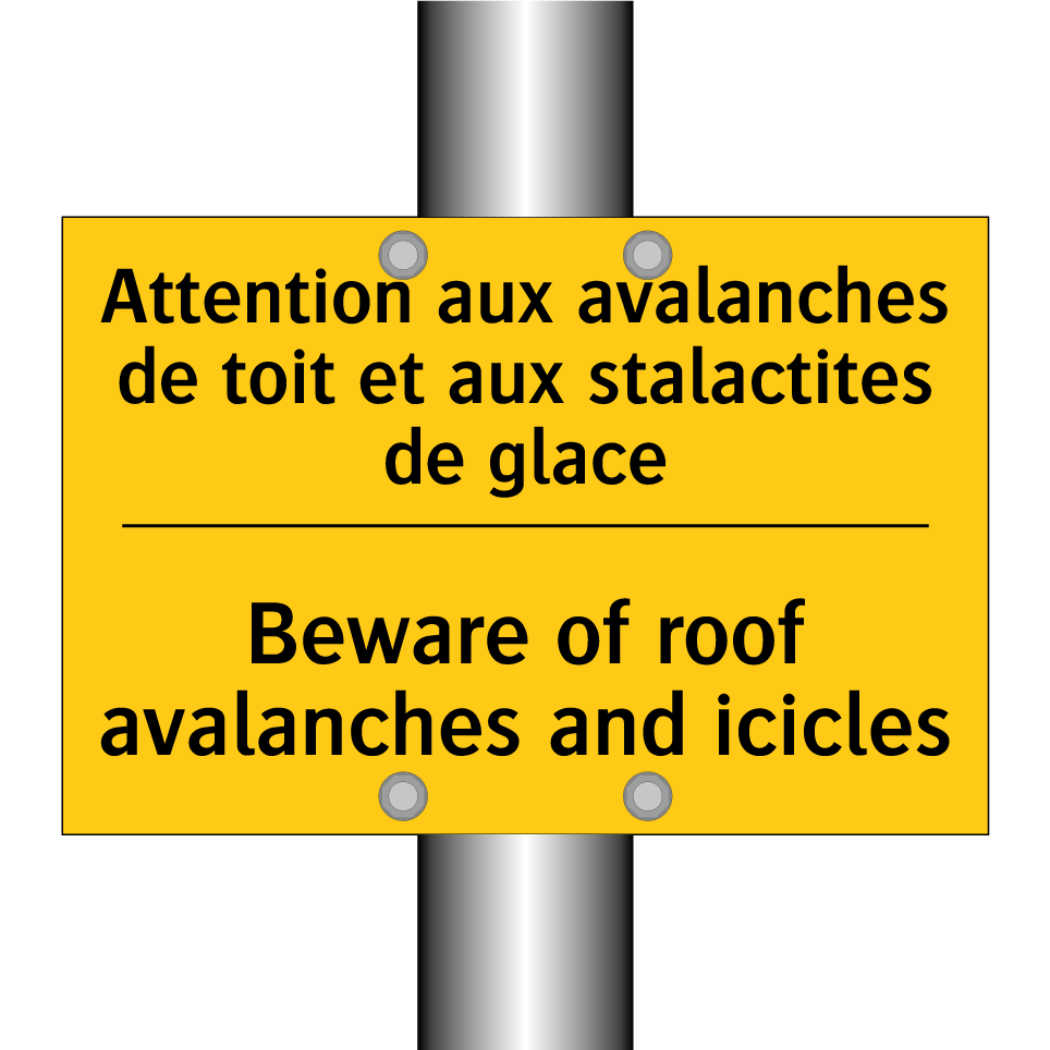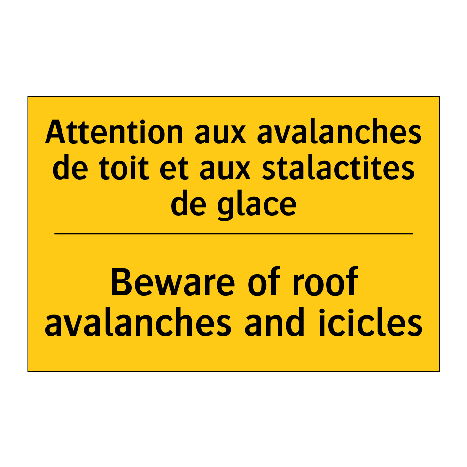 Panneau d'avertissement bilingue avec texte en français : "Attention aux avalanches de toit et aux stalactites de glace", et en anglais : "Beware of roof avalanches and icicles"