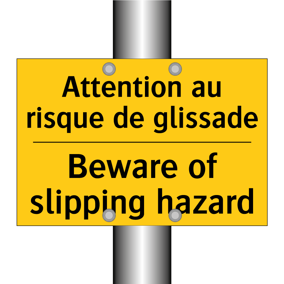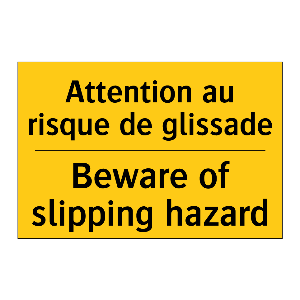 Panneau d'avertissement bilingue avec texte en français : "Attention au risque de glissade", et en anglais : "Beware of slipping hazard"