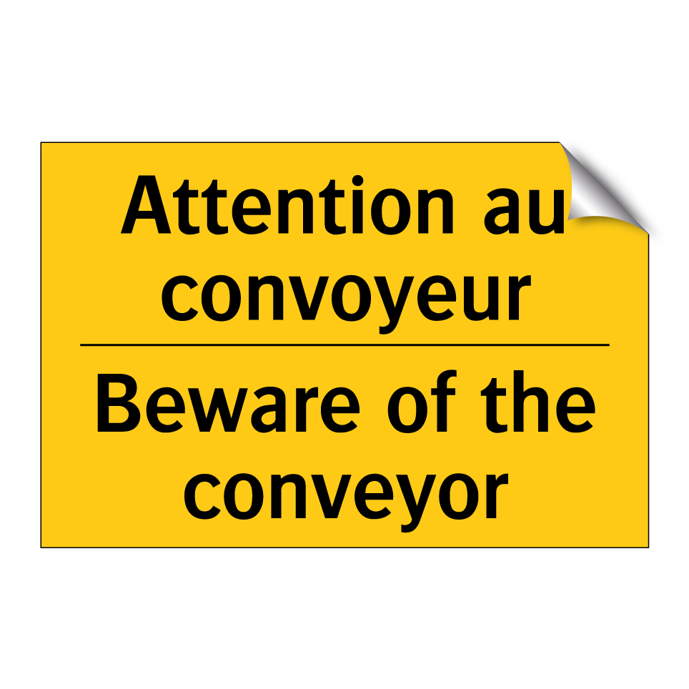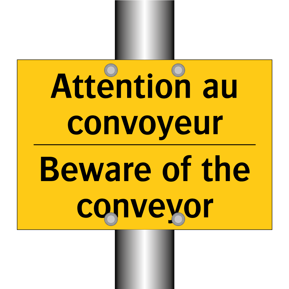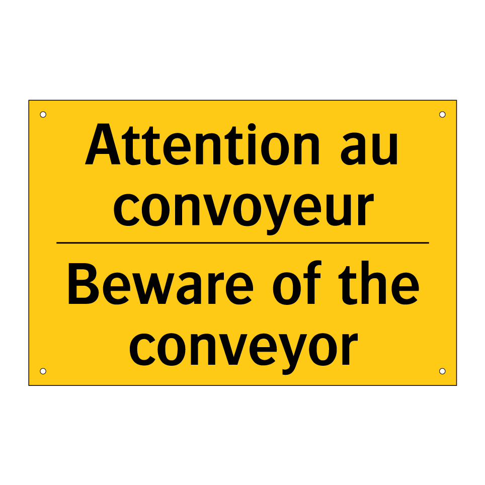 Panneau d'avertissement bilingue avec texte en français : "Attention au convoyeur", et en anglais : "Beware of the conveyor"
