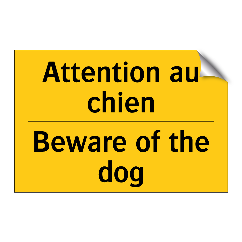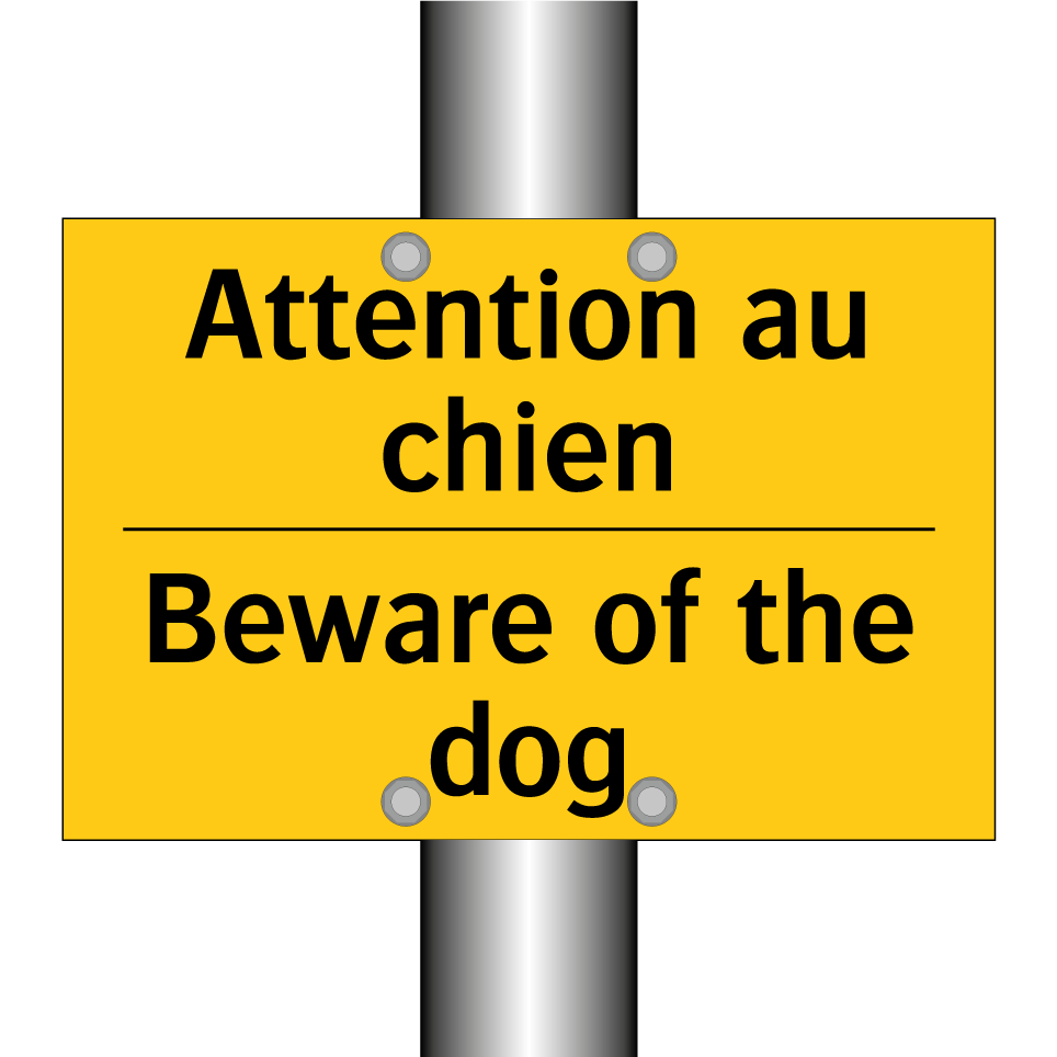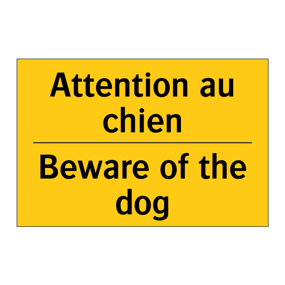 Panneau d'avertissement bilingue avec texte en français : "Attention au chien", et en anglais : "Beware of the dog"