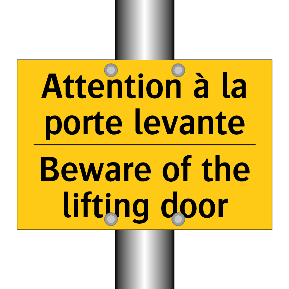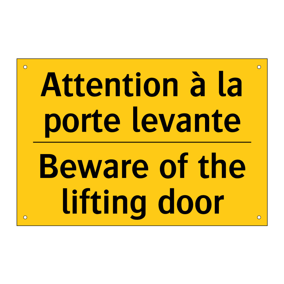 Panneau d'avertissement bilingue avec texte en français : "Attention à la porte levante", et en anglais : "Beware of the lifting door"