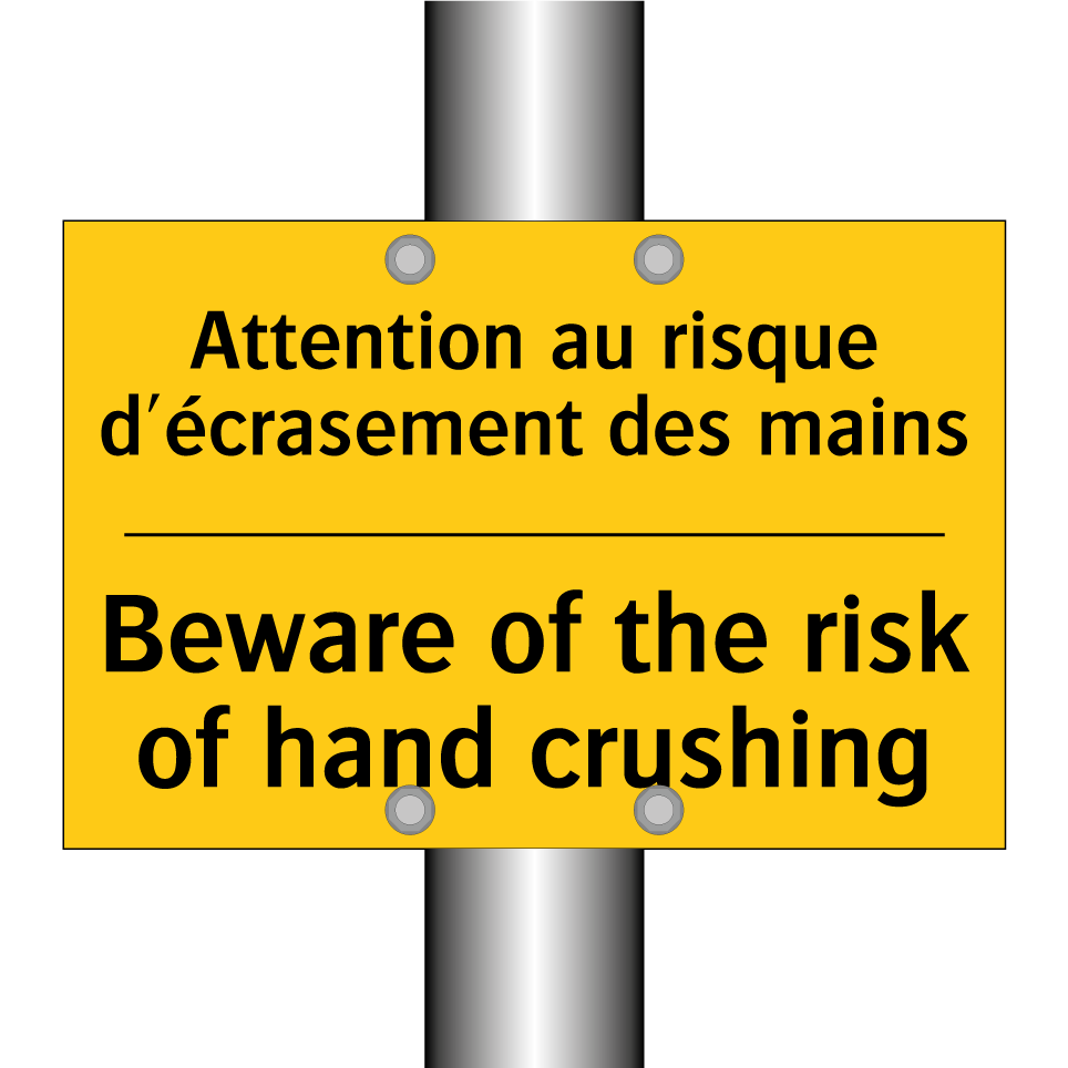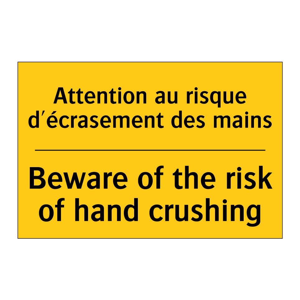 Panneau d'avertissement bilingue avec texte en français : "Attention au risque d'écrasement des mains", et en anglais : "Beware of the risk of hand crushing"