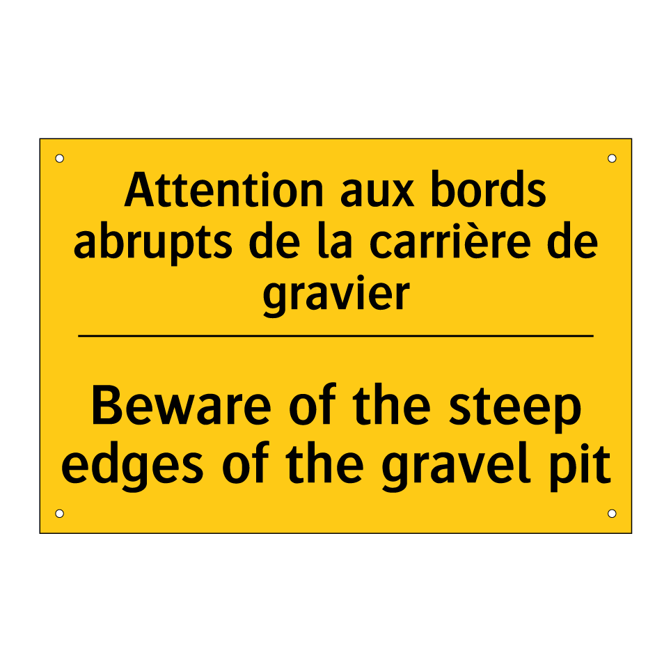 Panneau d'avertissement bilingue avec texte en français : "Attention aux bords abrupts de la carrière de gravier", et en anglais : "Beware of the steep edges of the gravel pit"
