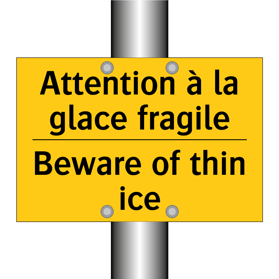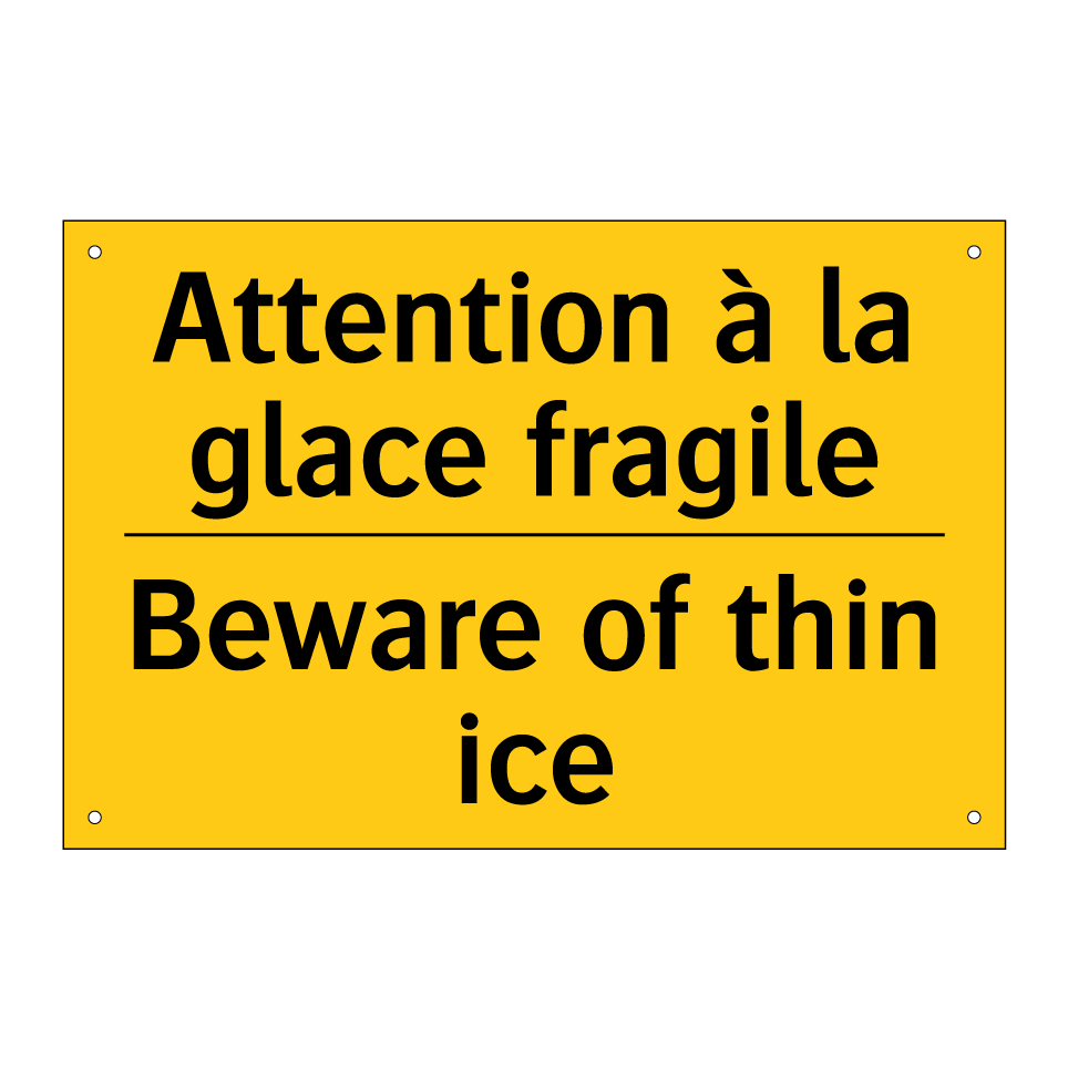 Panneau d'avertissement bilingue avec texte en français : "Attention à la glace fragile", et en anglais : "Beware of thin ice"