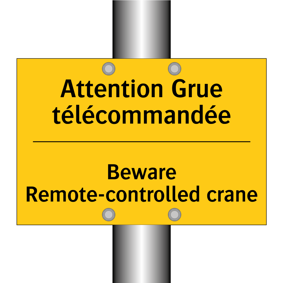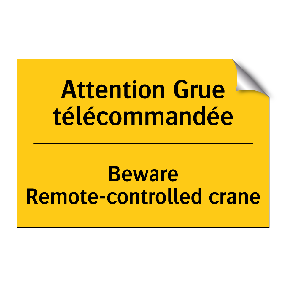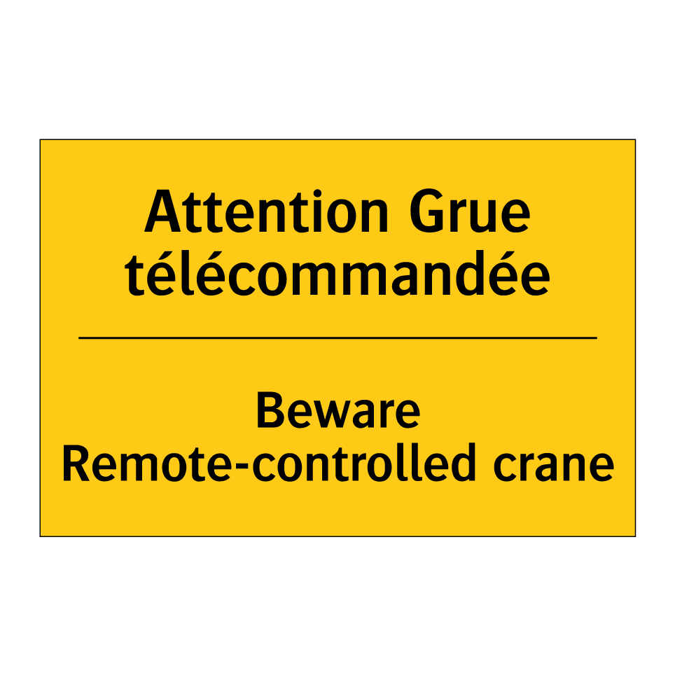 Panneau d'avertissement bilingue avec texte en français : "Attention Grue télécommandée", et en anglais : "Beware Remote-controlled crane"