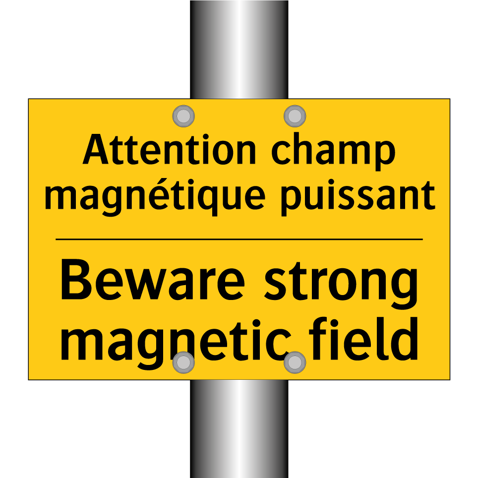 Panneau d'avertissement bilingue avec texte en français : "Attention champ magnétique puissant", et en anglais : "Beware strong magnetic field"