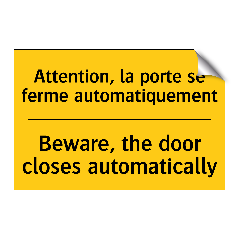 Panneau d'avertissement bilingue avec texte en français : "Attention, la porte se ferme automatiquement", et en anglais : "Beware, the door closes automatically"