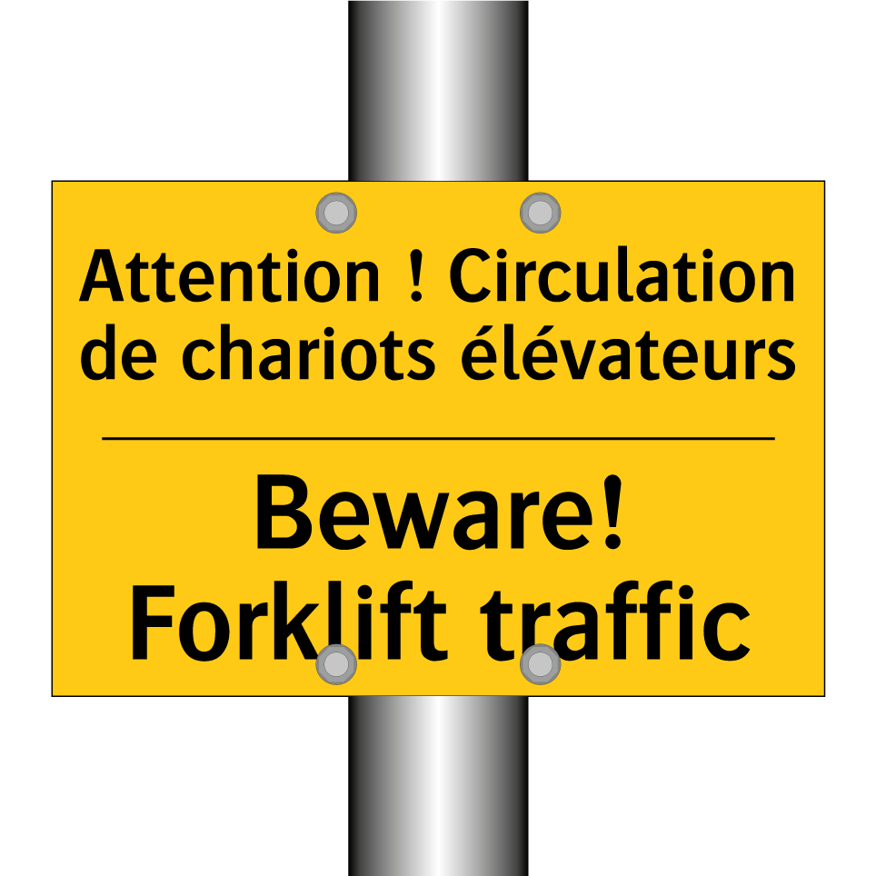 Panneau d'avertissement bilingue avec texte en français : "Attention ! Circulation de chariots élévateurs", et en anglais : "Beware! Forklift traffic"