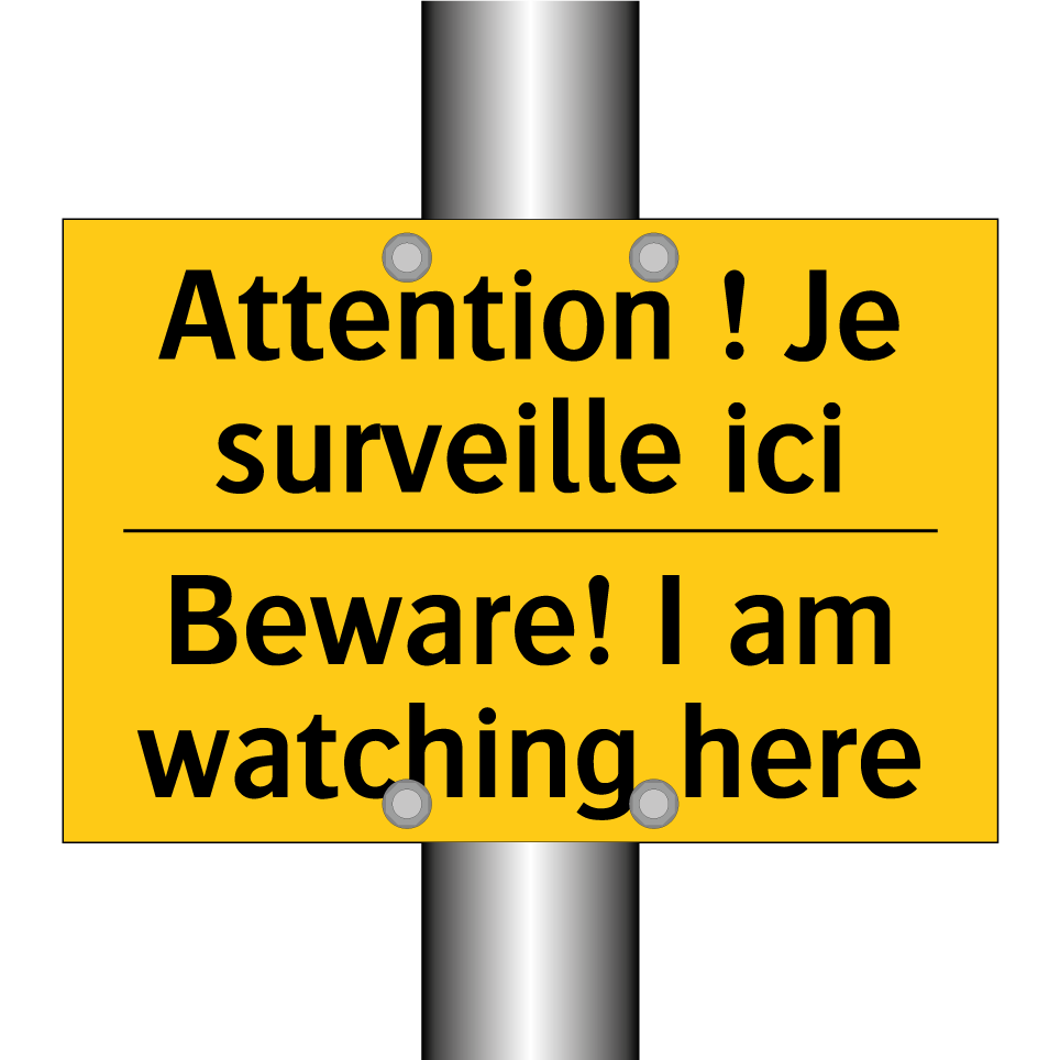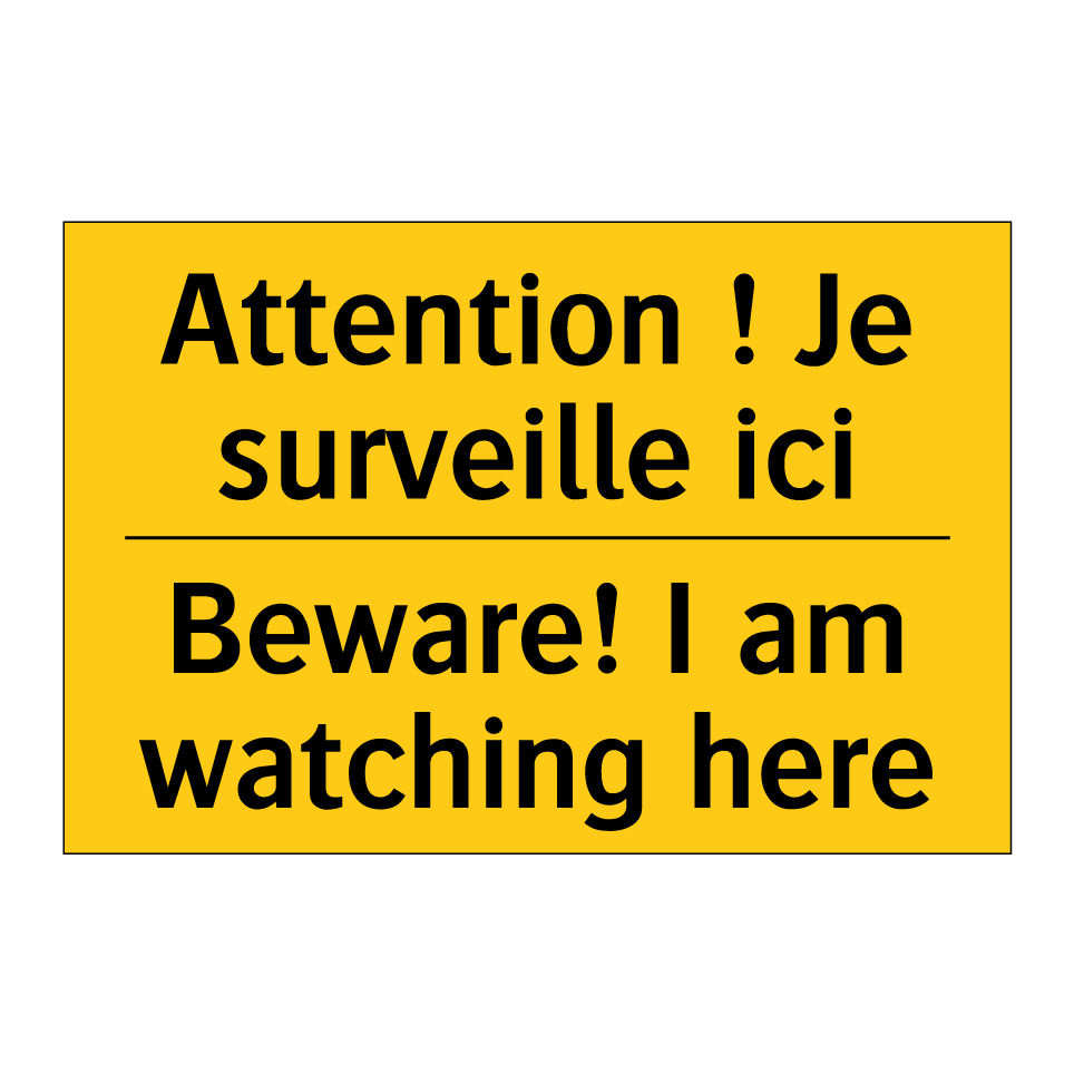 Panneau d'avertissement bilingue avec texte en français : "Attention ! Je surveille ici", et en anglais : "Beware! I am watching here"