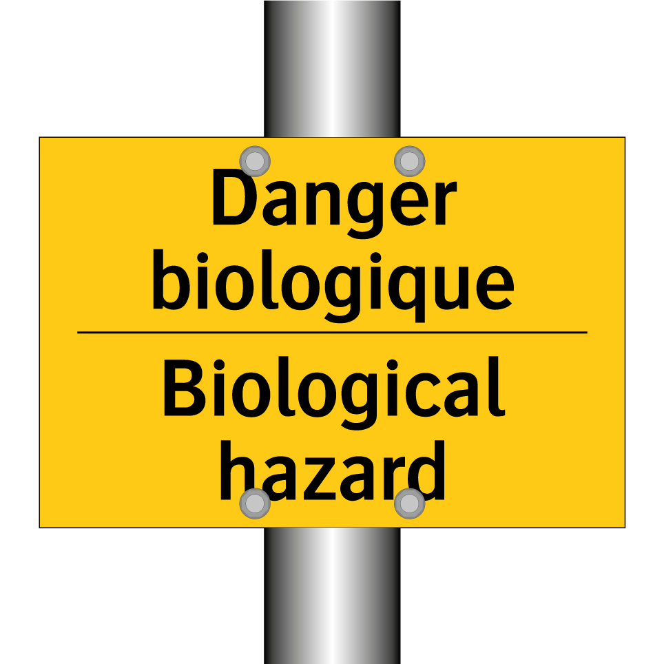 Panneau d'avertissement bilingue avec texte en français : "Danger biologique", et en anglais : "Biological hazard"