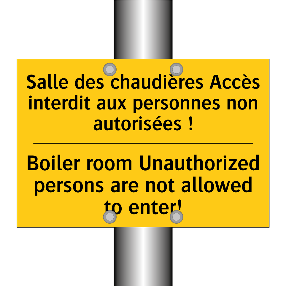 Panneau d'avertissement bilingue avec texte en français : "Salle des chaudières Accès interdit aux personnes non autorisées !", et en anglais : "Boiler room Unauthorized persons are not allowed to enter!"