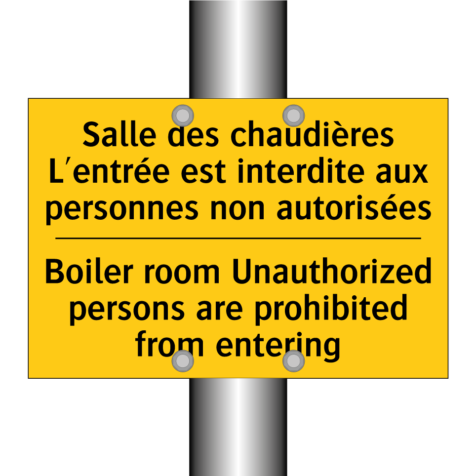 Panneau d'avertissement bilingue avec texte en français : "Salle des chaudières L'entrée est interdite aux personnes non autorisées", et en anglais : "Boiler room Unauthorized persons are prohibited from entering"