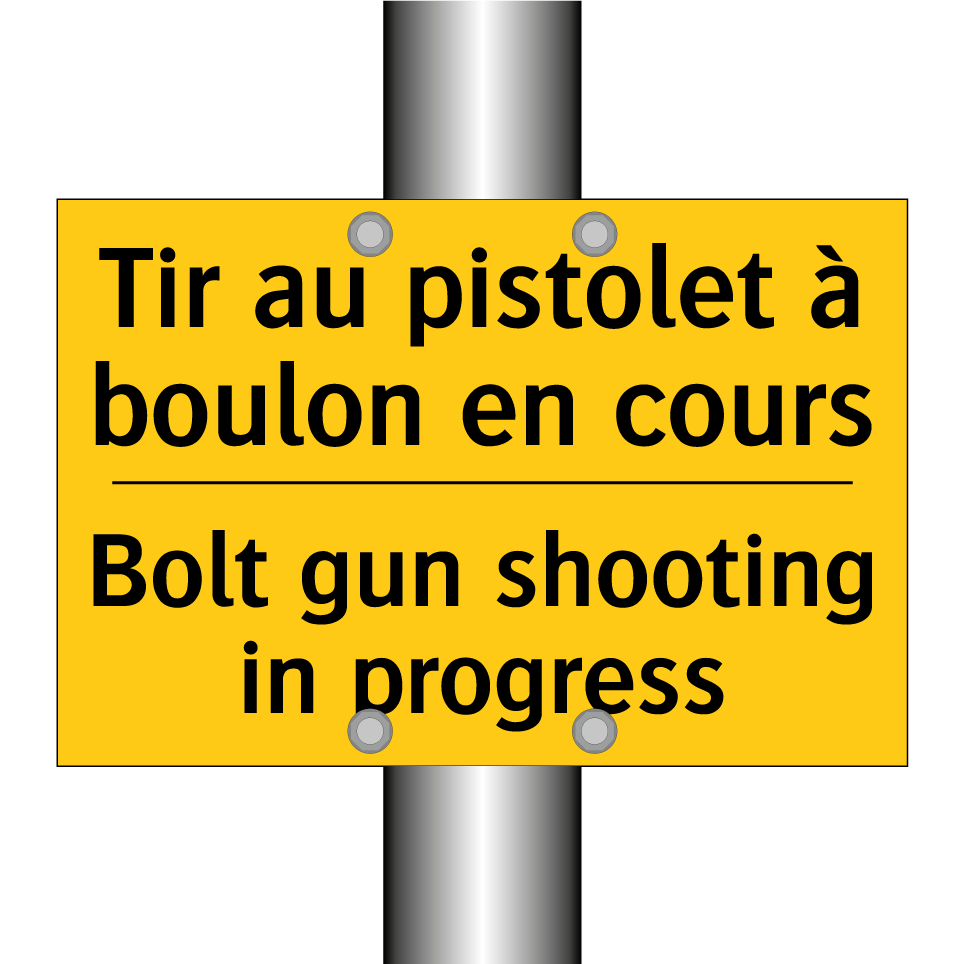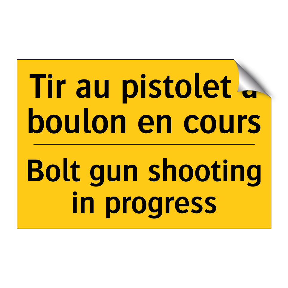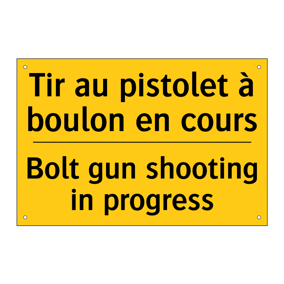 Panneau d'avertissement bilingue avec texte en français : "Tir au pistolet à boulon en cours", et en anglais : "Bolt gun shooting in progress"
