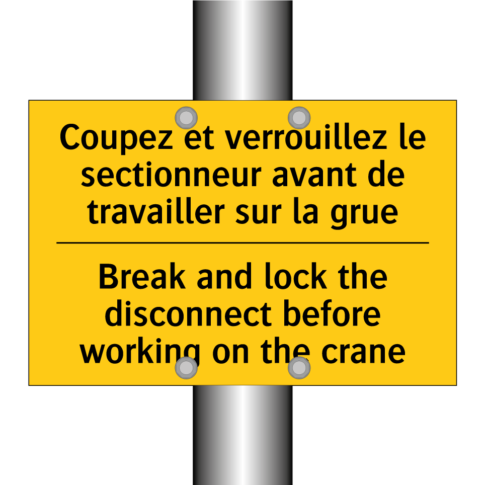 Panneau d'avertissement bilingue avec texte en français : "Coupez et verrouillez le sectionneur avant de travailler sur la grue", et en anglais : "Break and lock the disconnect before working on the crane"