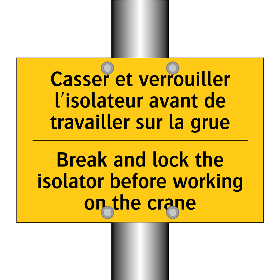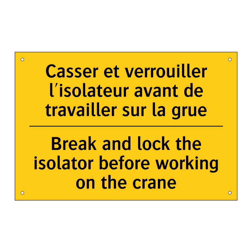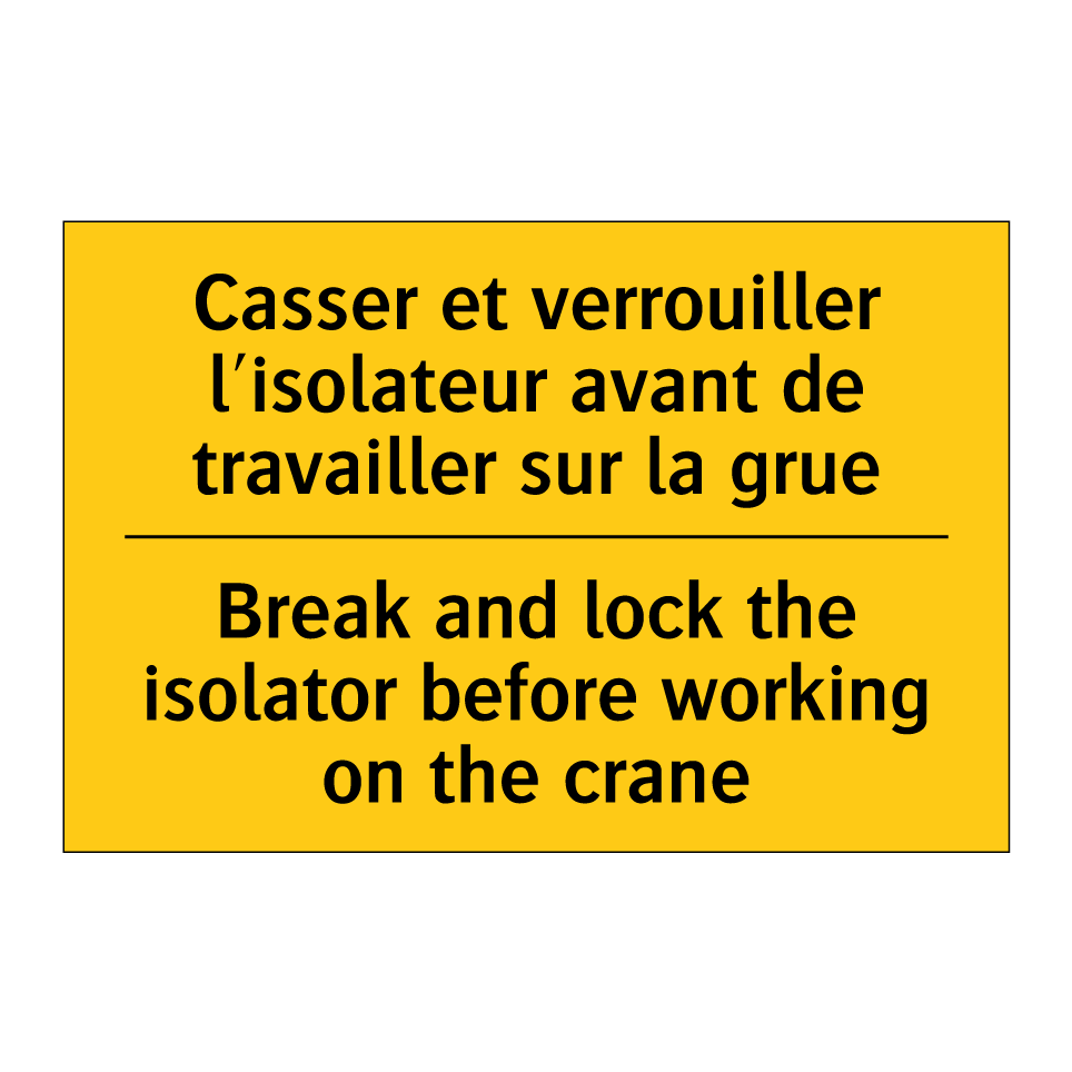 Panneau d'avertissement bilingue avec texte en français : "Casser et verrouiller l'isolateur avant de travailler sur la grue", et en anglais : "Break and lock the isolator before working on the crane"