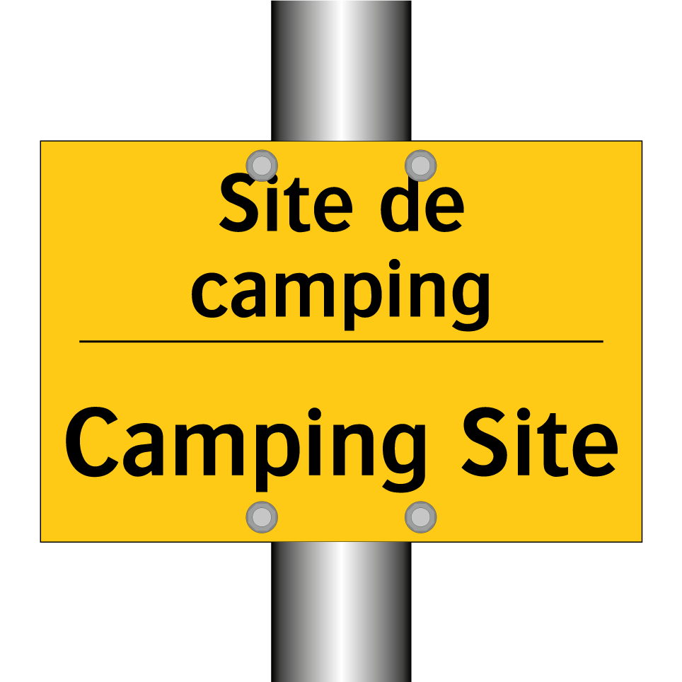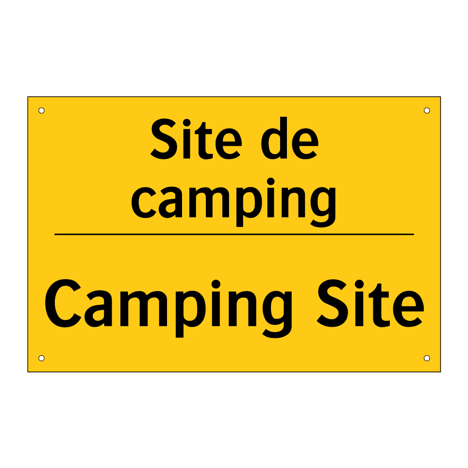 Panneau d'avertissement bilingue avec texte en français : "Site de camping", et en anglais : "Camping Site"