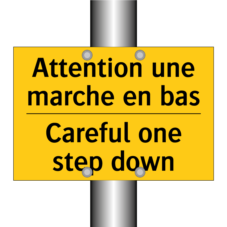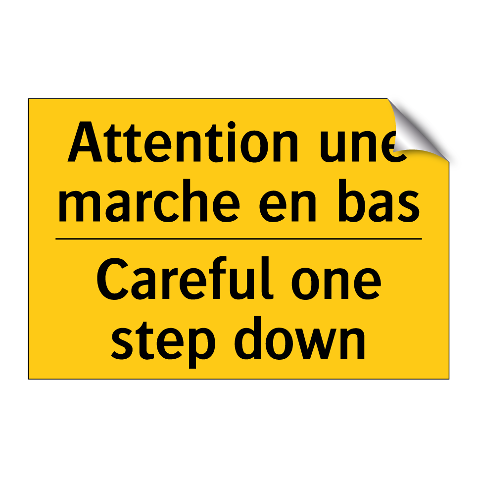 Panneau d'avertissement bilingue avec texte en français : "Attention une marche en bas", et en anglais : "Careful one step down"