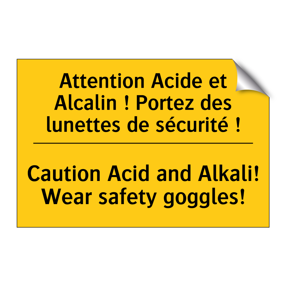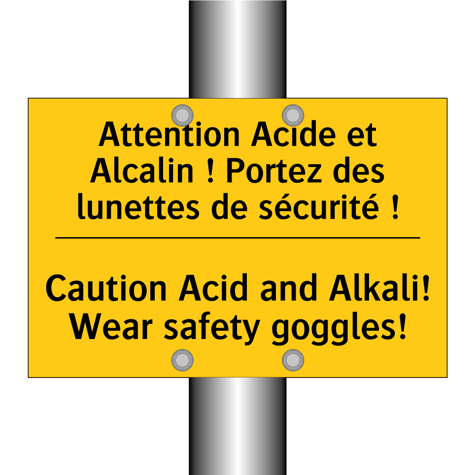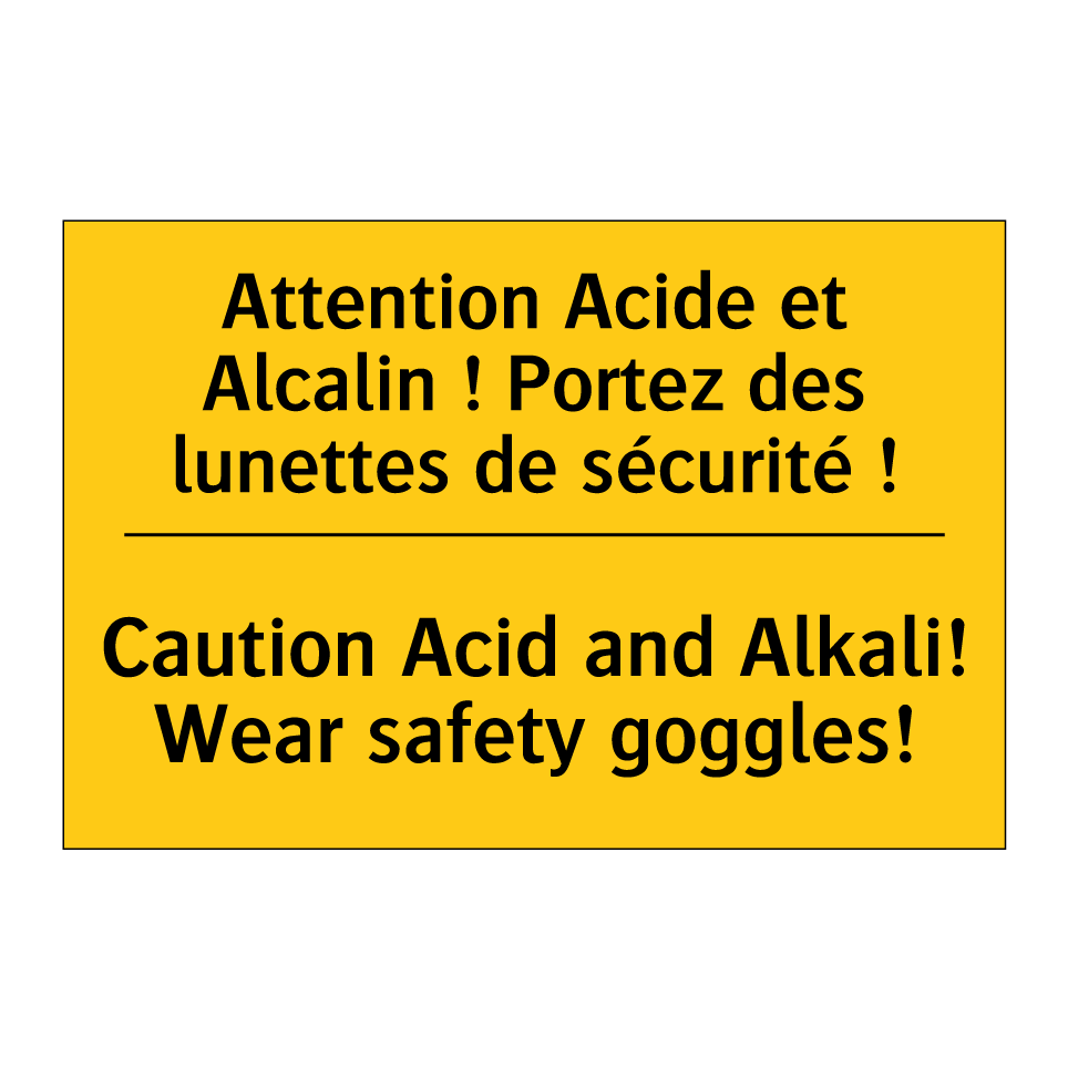 Panneau d'avertissement bilingue avec texte en français : "Attention Acide et Alcalin ! Portez des lunettes de sécurité !", et en anglais : "Caution Acid and Alkali! Wear safety goggles!"