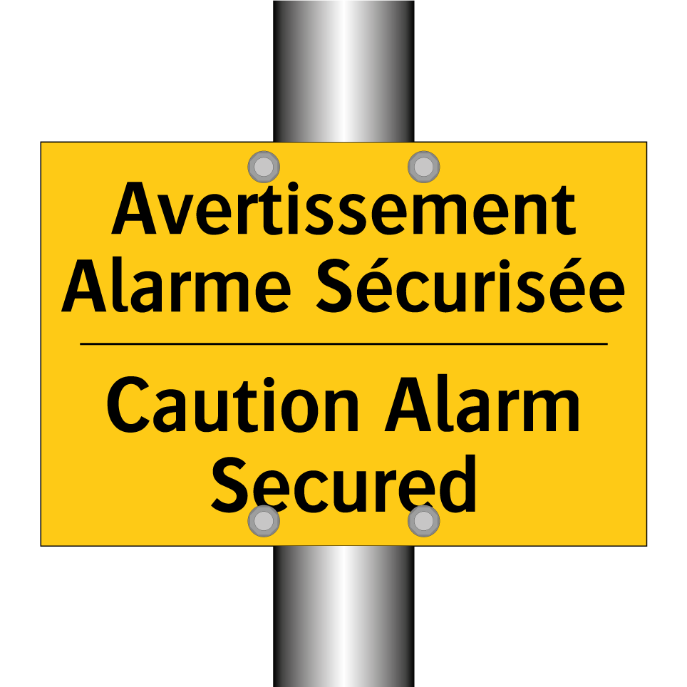 Panneau d'avertissement bilingue avec texte en français : "Avertissement Alarme Sécurisée", et en anglais : "Caution Alarm Secured"
