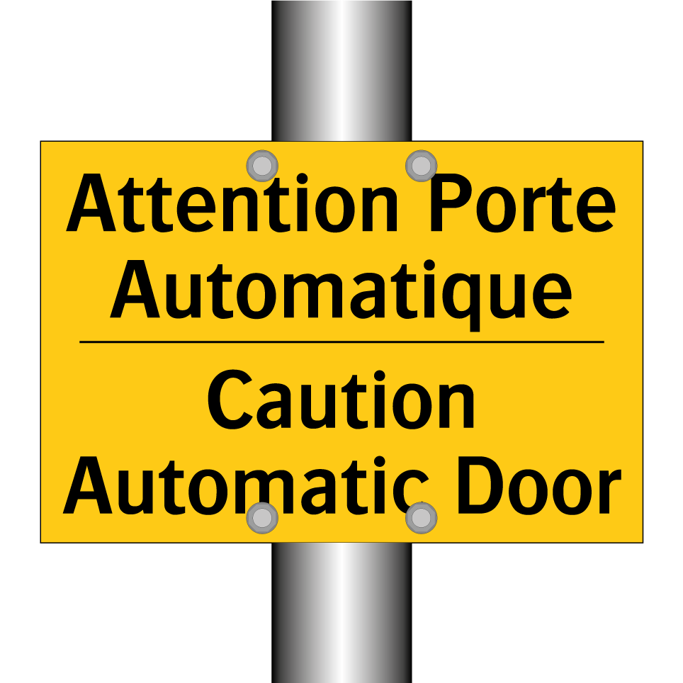 Panneau d'avertissement bilingue avec texte en français : "Attention Porte Automatique", et en anglais : "Caution Automatic Door"