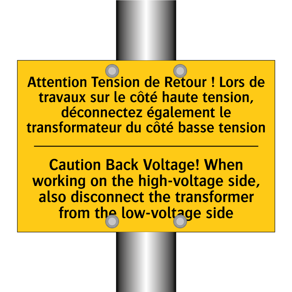 Panneau d'avertissement bilingue avec texte en français : "Attention Tension de Retour ! Lors de travaux sur le côté haute tension, déconnectez également le transformateur du côté basse tension", et en anglais : "Caution Back Voltage! When working on the high-voltage side, also disconnect the transformer from the low-voltage side"