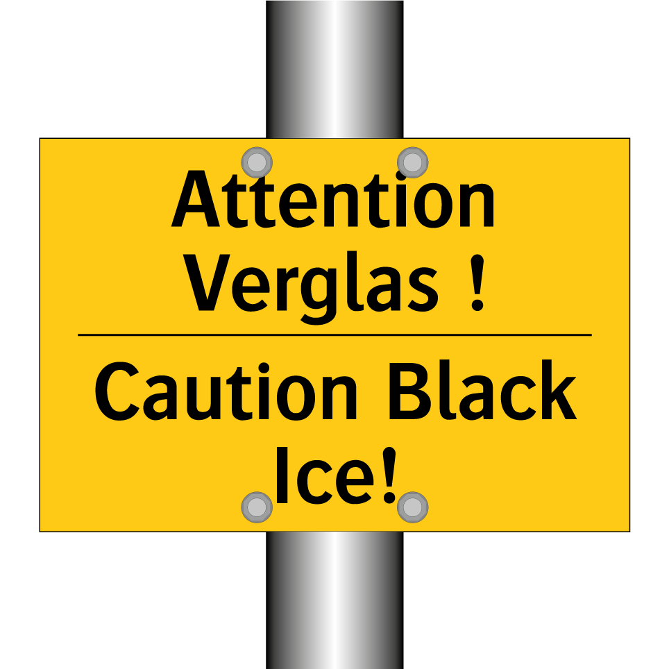 Panneau d'avertissement bilingue avec texte en français : "Attention Verglas !", et en anglais : "Caution Black Ice!"