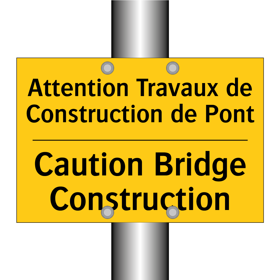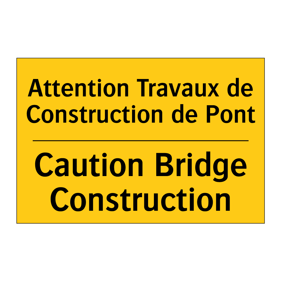 Panneau d'avertissement bilingue avec texte en français : "Attention Travaux de Construction de Pont", et en anglais : "Caution Bridge Construction"