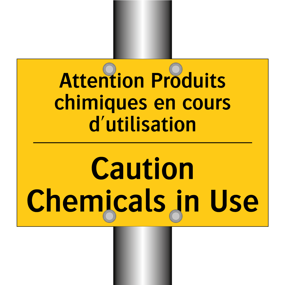 Panneau d'avertissement bilingue avec texte en français : "Attention Produits chimiques en cours d'utilisation", et en anglais : "Caution Chemicals in Use"