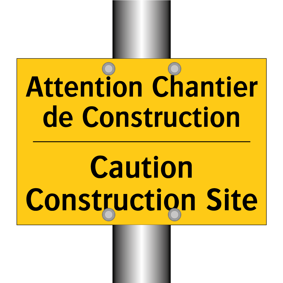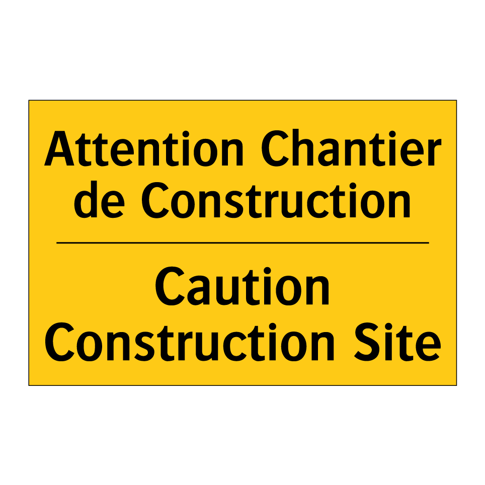 Panneau d'avertissement bilingue avec texte en français : "Attention Chantier de Construction", et en anglais : "Caution Construction Site"