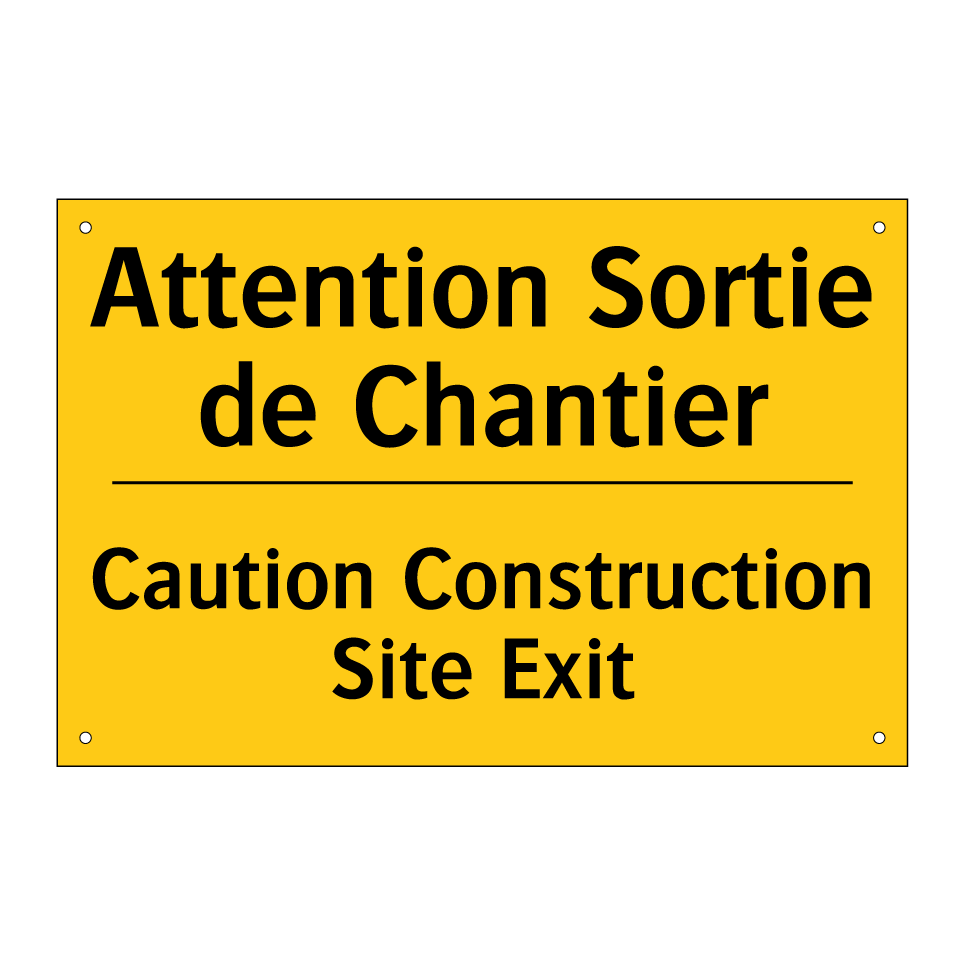 Panneau d'avertissement bilingue avec texte en français : "Attention Sortie de Chantier", et en anglais : "Caution Construction Site Exit"